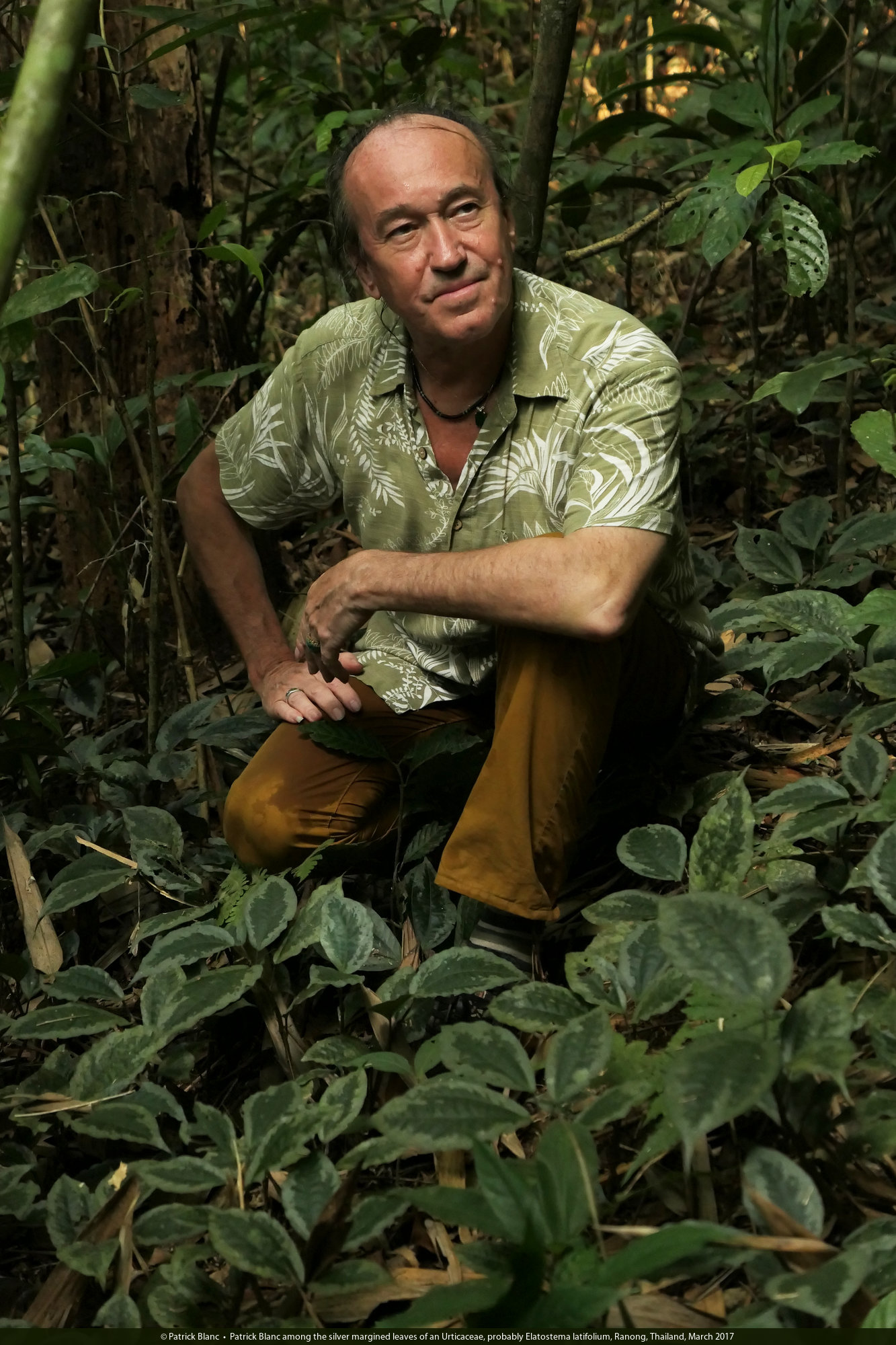 Patrick Blanc among the silver margined leaves of an Urticaceae, probably Elatostema latifolium, Ranong, Thailand, March 2017