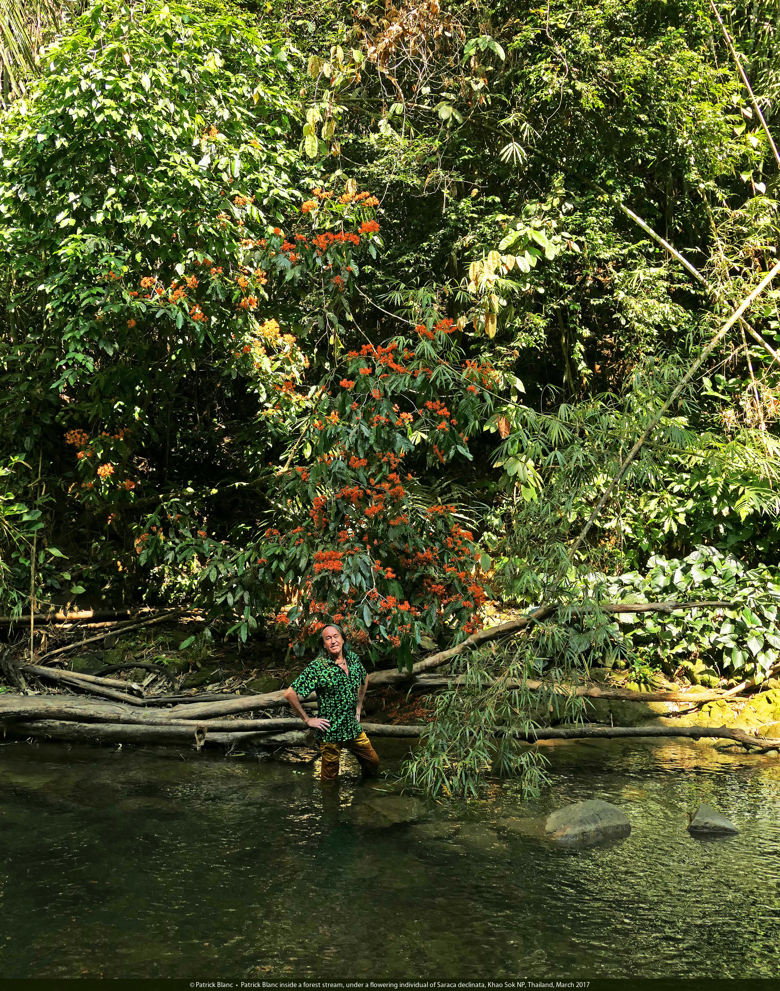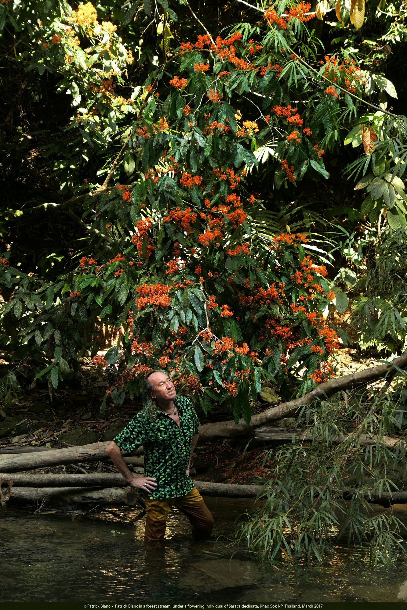 Patrick Blanc in a forest stream, under a flowering individual of Saraca declinata, Khao Sok NP, Thailand, March 2017