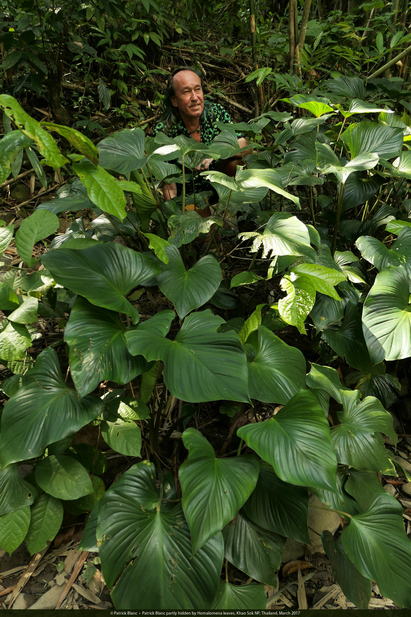 Patrick Blanc partly hidden by Homalomena leaves, Khao Sok NP, Thailand, March 2017