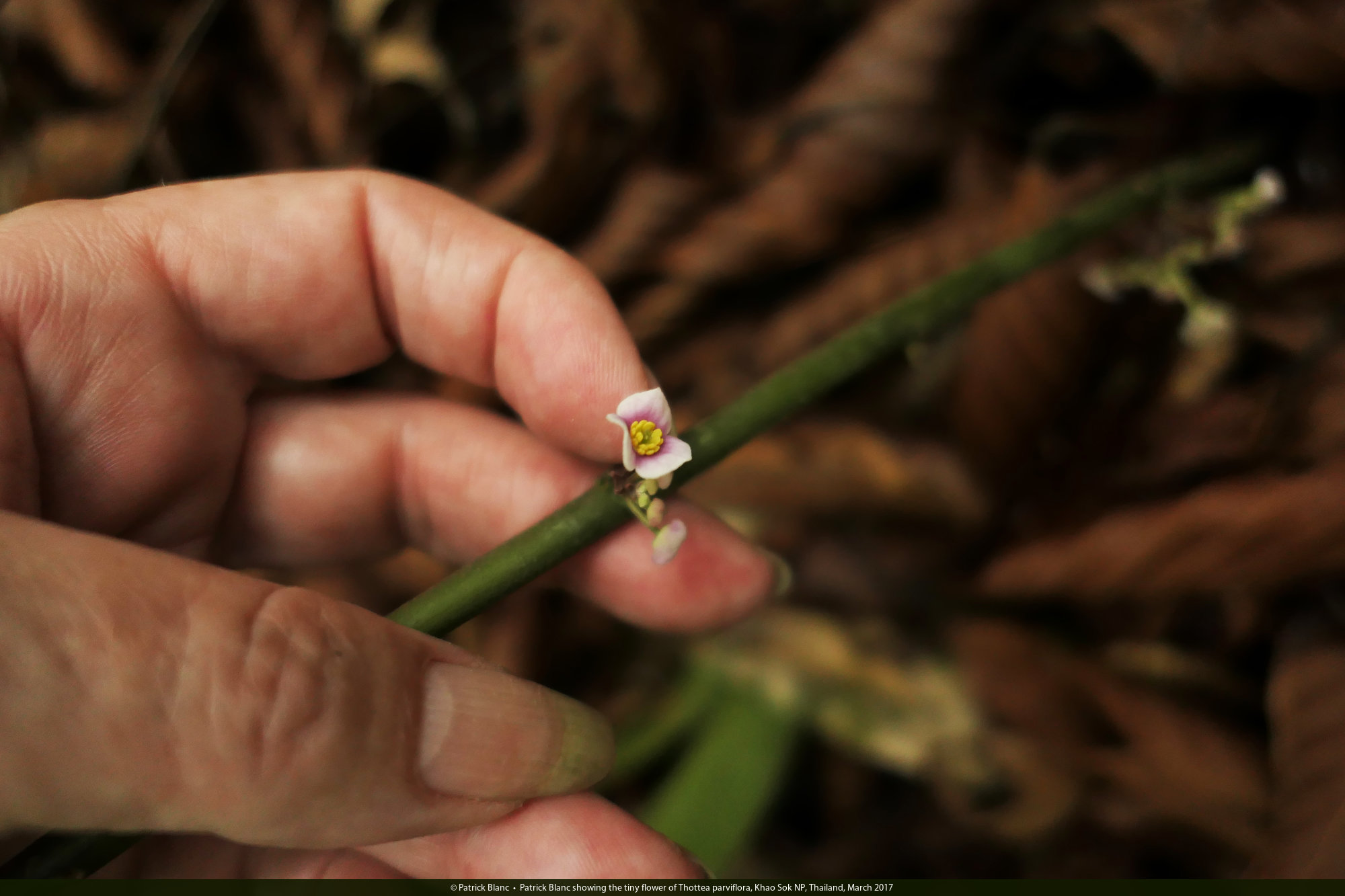 Patrick Blanc showing the tiny flower of Thottea parviflora, Khao Sok NP, Thailand, March 2017