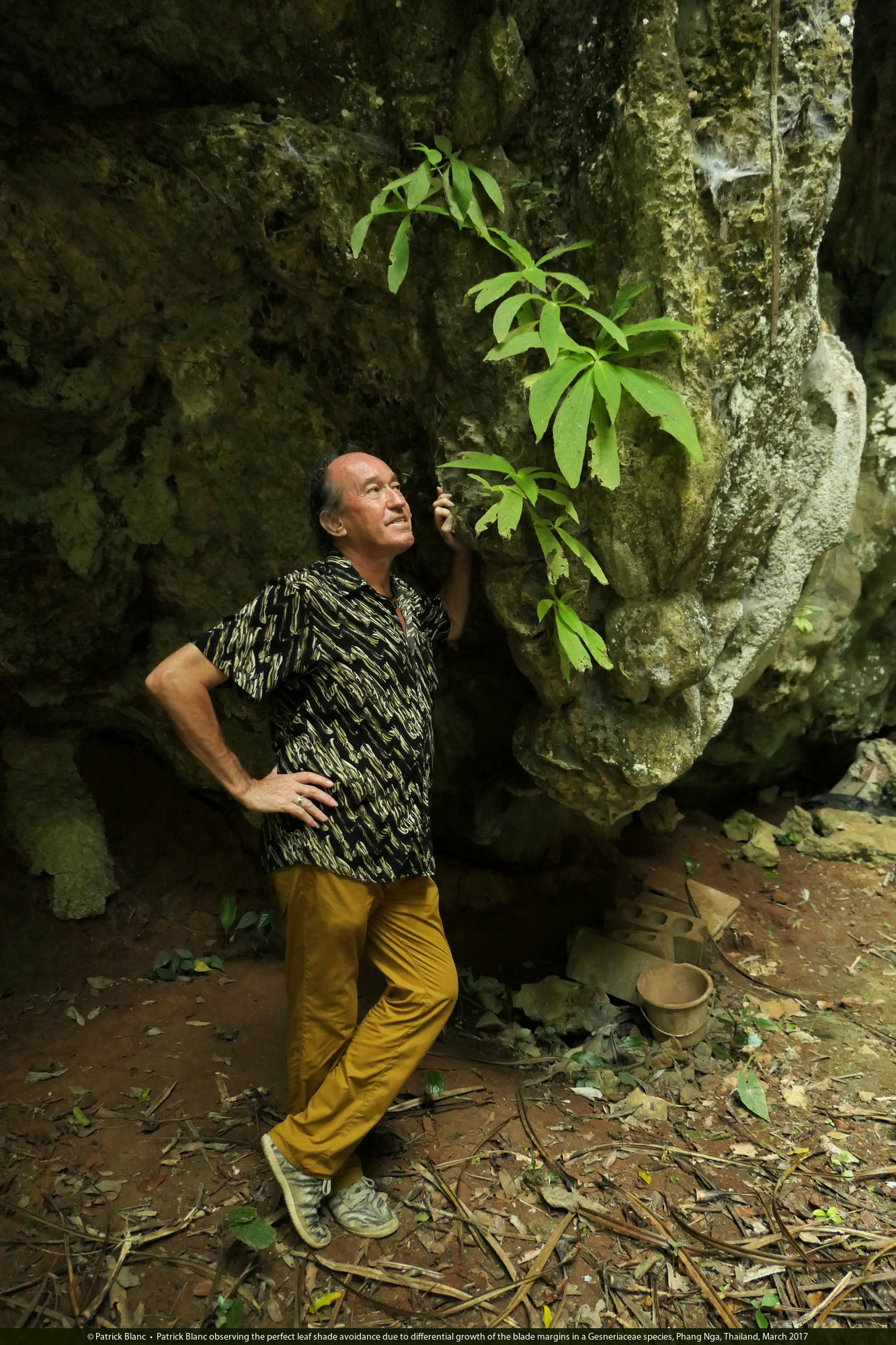 Patrick Blanc observing the perfect leaf shade avoidance due to differential growth of the blade margins in a Gesneriaceae species, Phang Nga, Thailand, March 2017