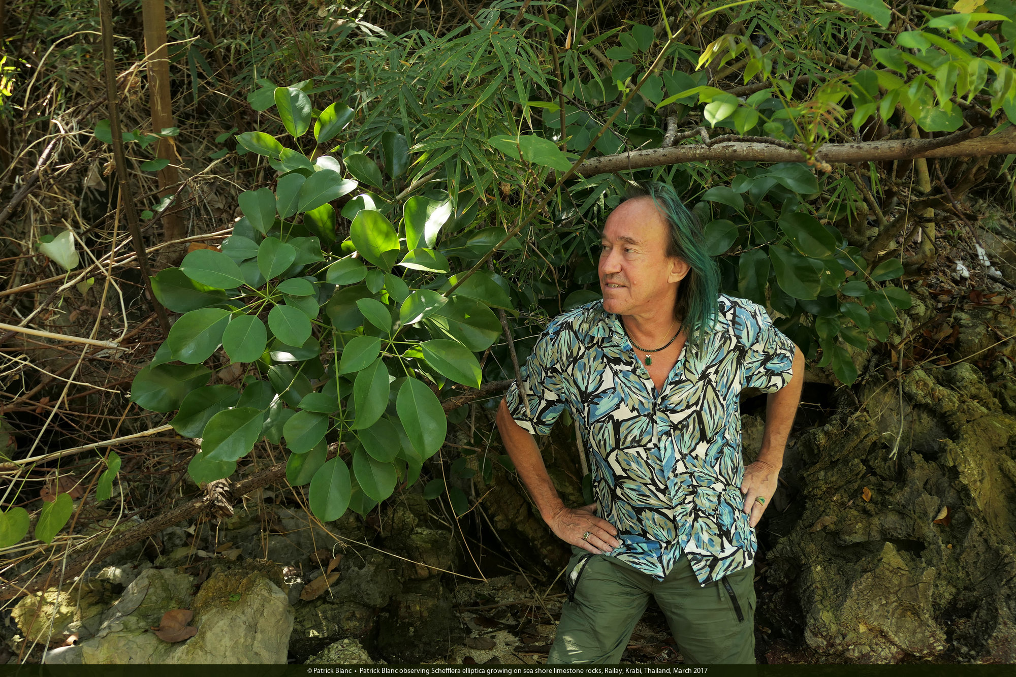 Patrick Blanc observing Heptapleurum ellipticum growing on sea shore limestone rocks, Railay, Krabi, Thailand, March 2017