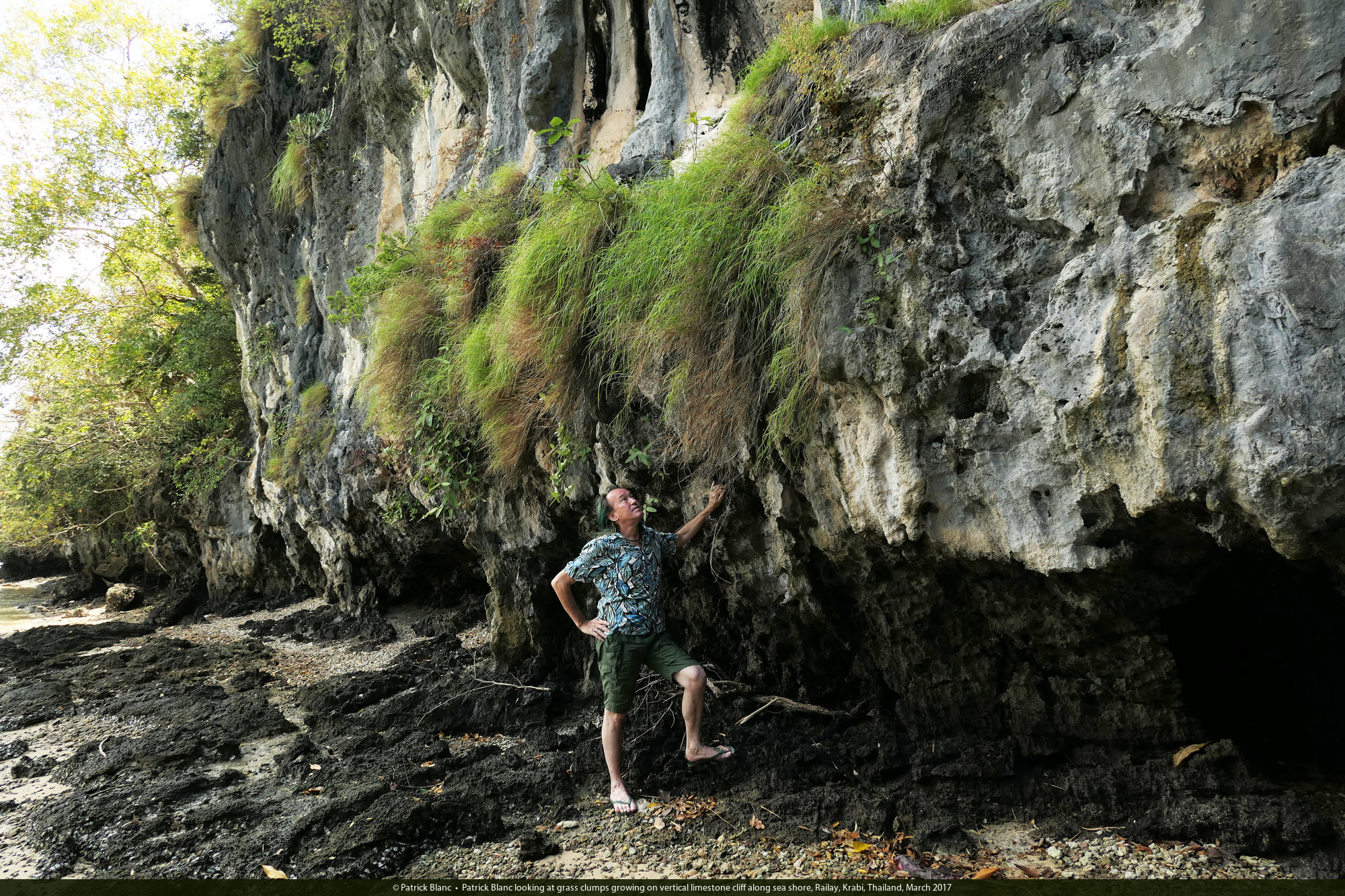Patrick Blanc observing grass clumps growing on vertical limestone cliff along sea shore, Railay, Krabi, Thailand, March 2017 [nid: 13240]