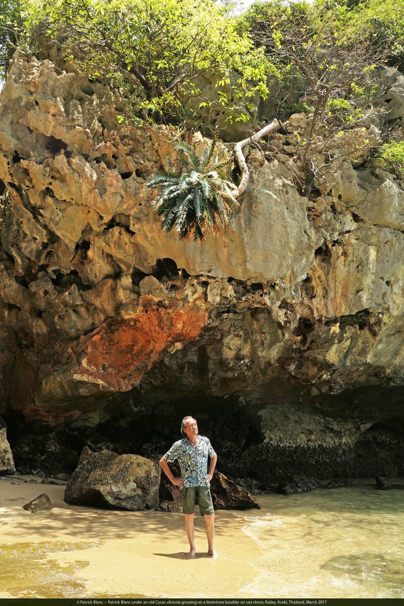 Patrick Blanc under an old Cycas clivicola growing on a limestone boulder on sea shore, Railay, Krabi, Thailand, March 2017