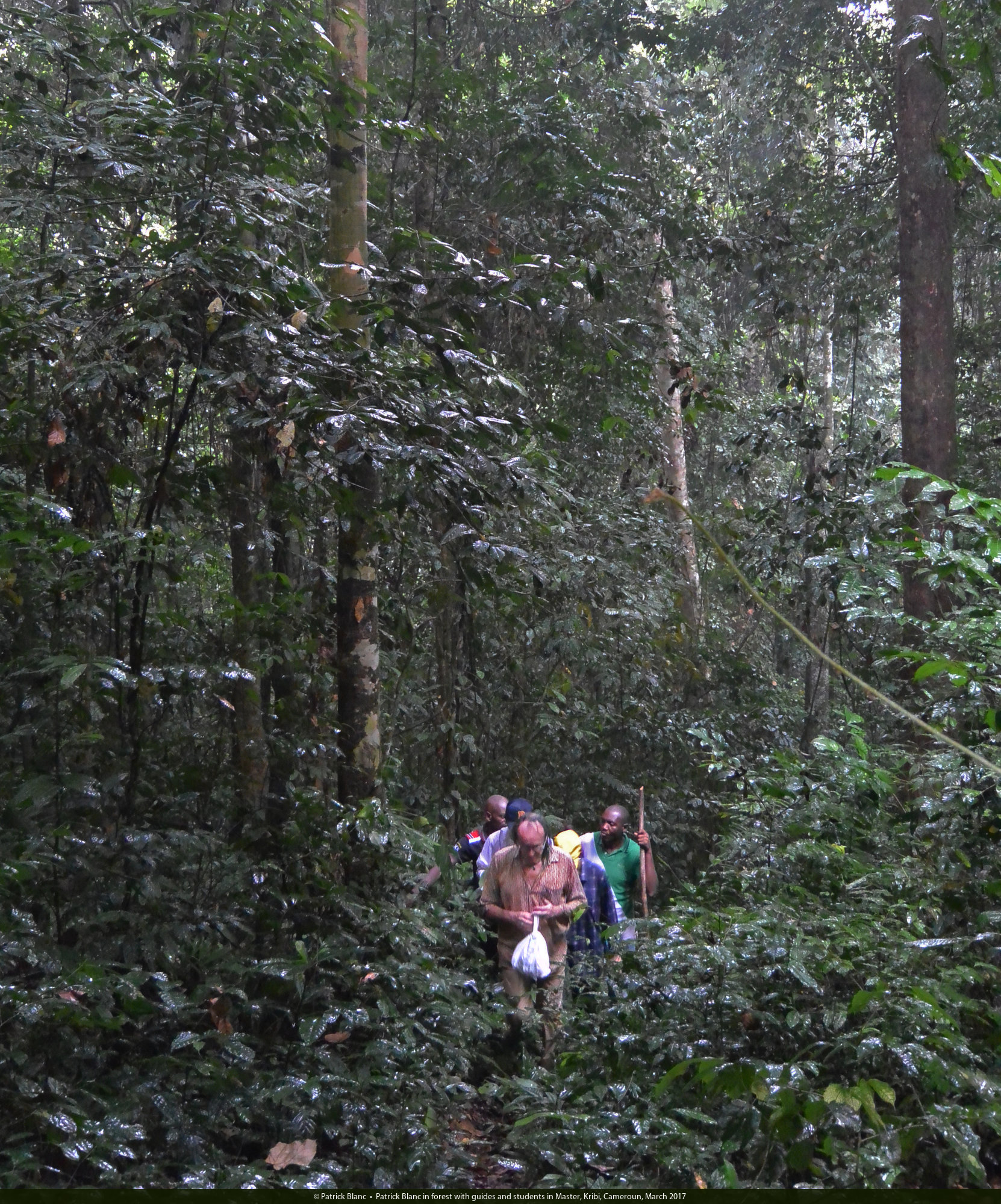 Patrick Blanc in forest with guides and students in Master, Kribi, Cameroun, March 2017