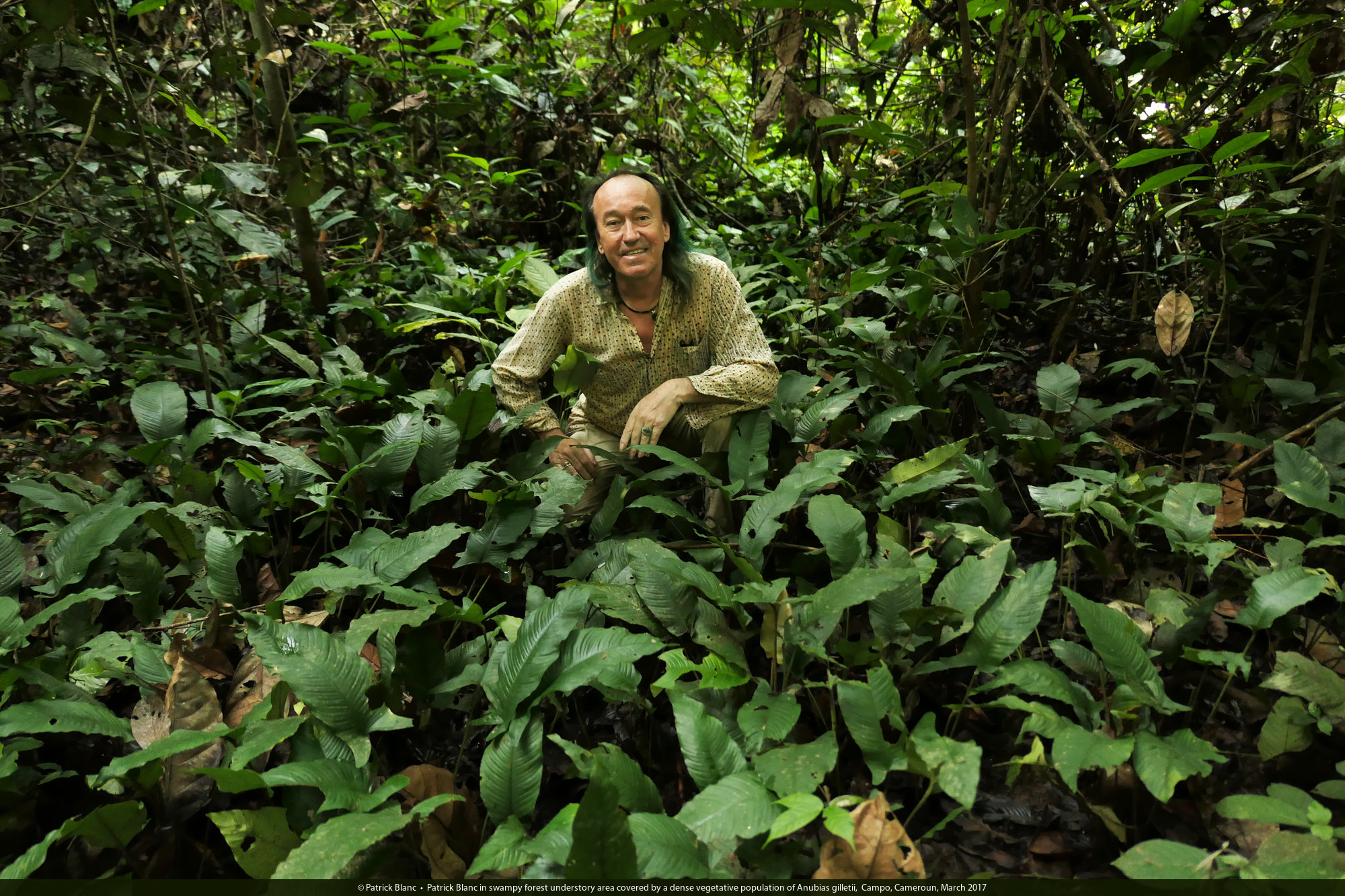 Patrick Blanc in swampy forest understory area covered by a dense vegetative population of Anubias gilletii, Campo, Cameroun, March 2017