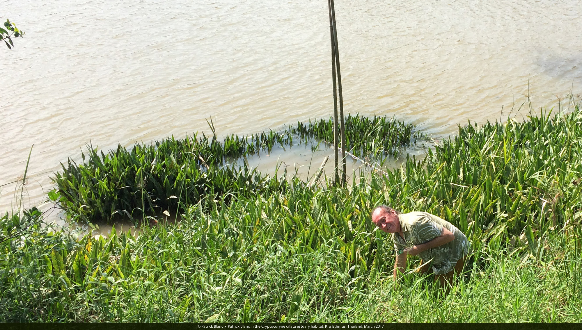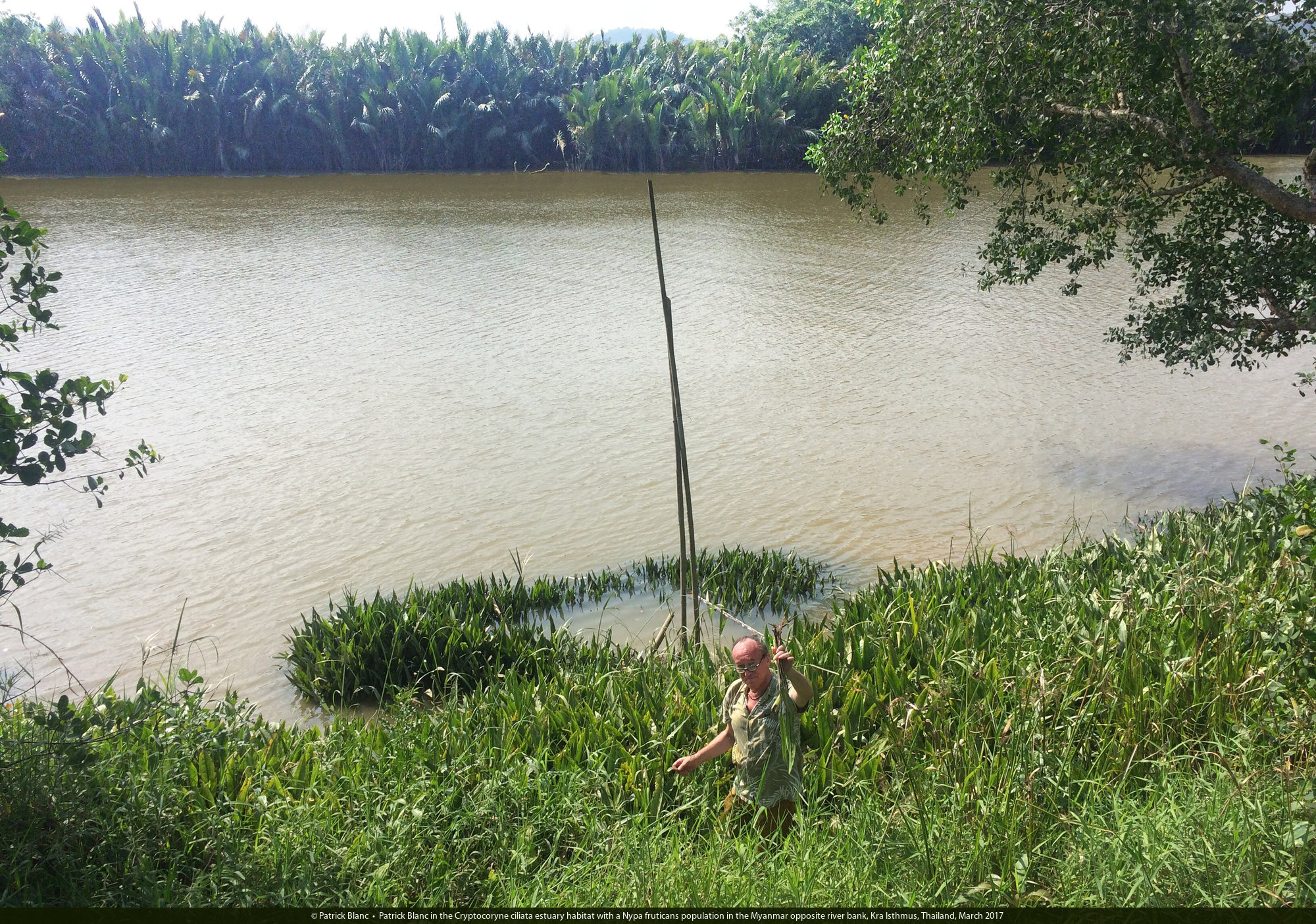 Patrick Blanc in the Cryptocoryne ciliata estuary habitat with a Nypa fruticans population in the Myanmar opposite river bank, Kra Isthmus, Thailand, March 2017