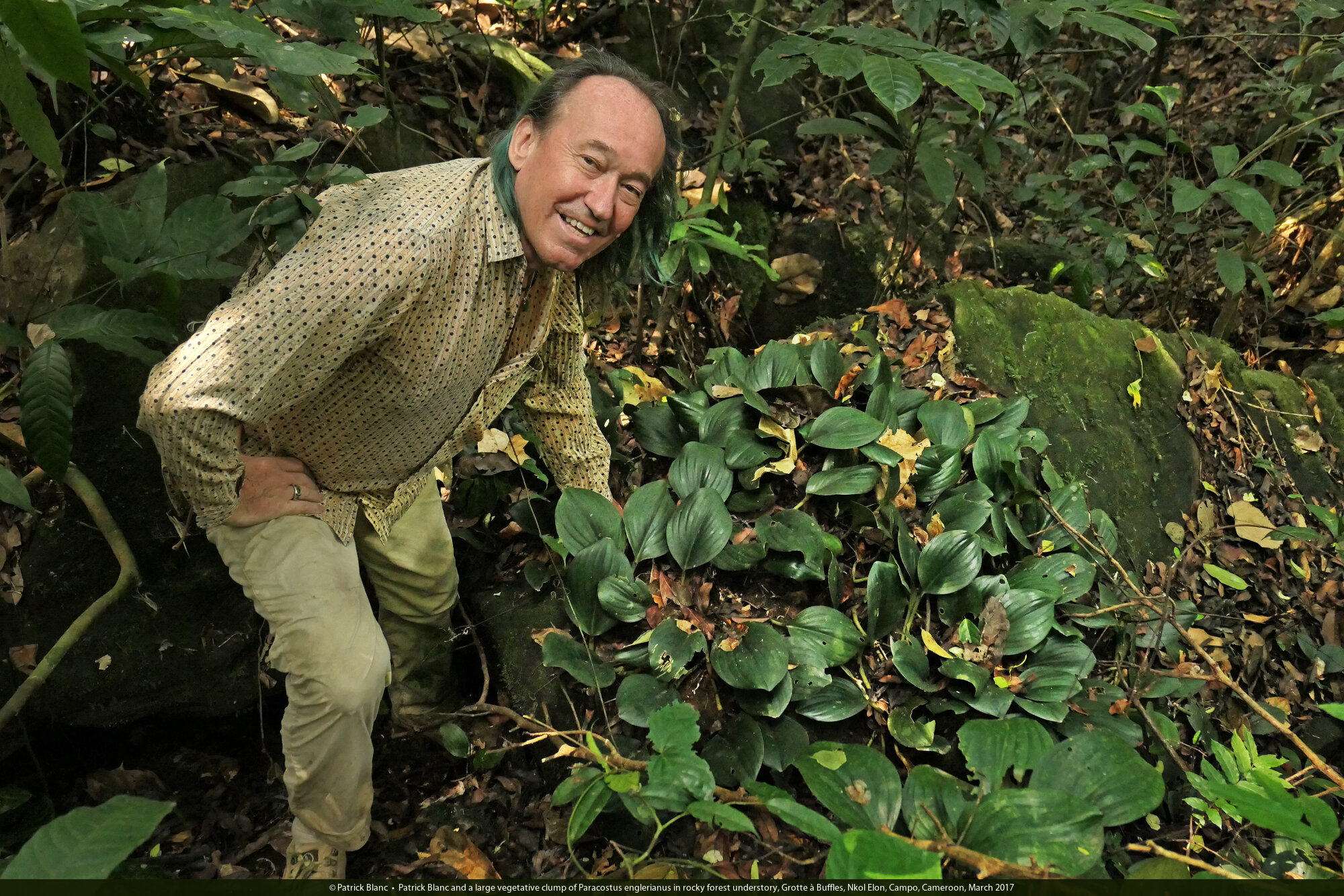 Patrick Blanc and a large vegetative clump of Paracostus englerianus in rocky forest understory, Grotte à Buffles, Nkol Elon, Campo, Cameroon, March 2017
