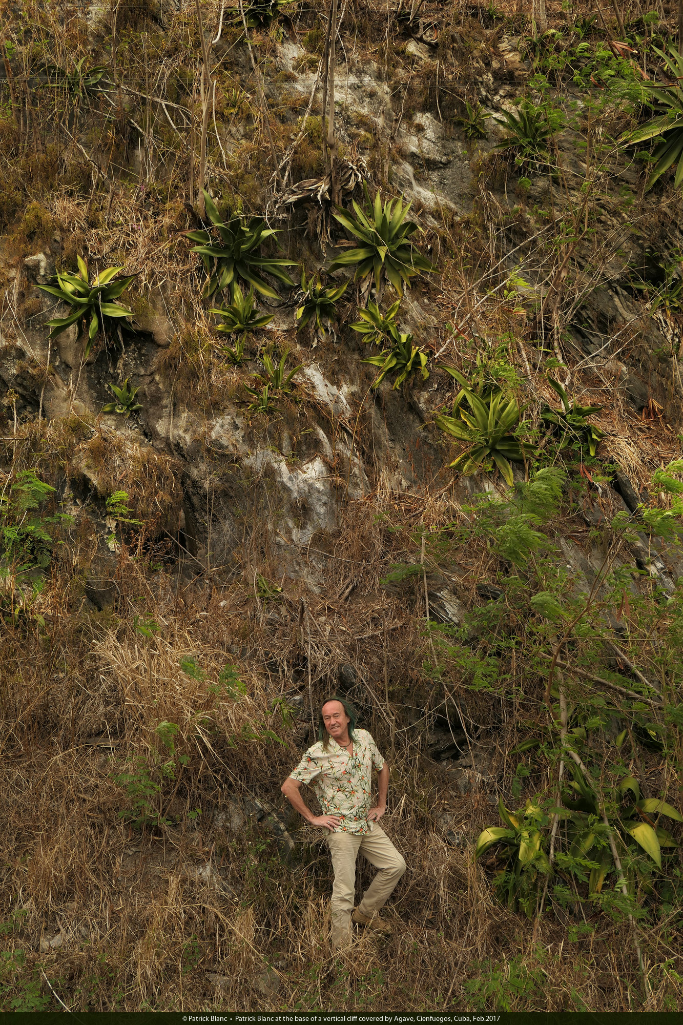 Patrick Blanc at the base of a vertical cliff covered by Agave, Cienfuegos, Cuba, Feb.2017