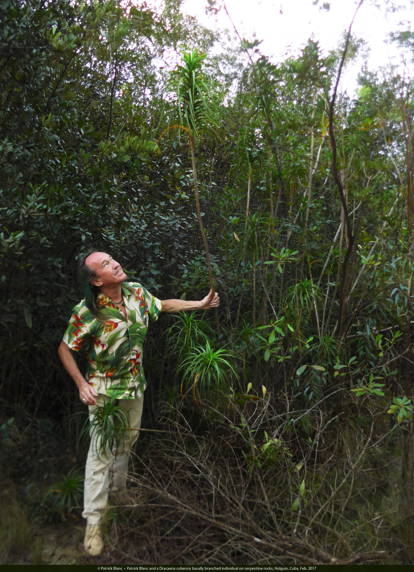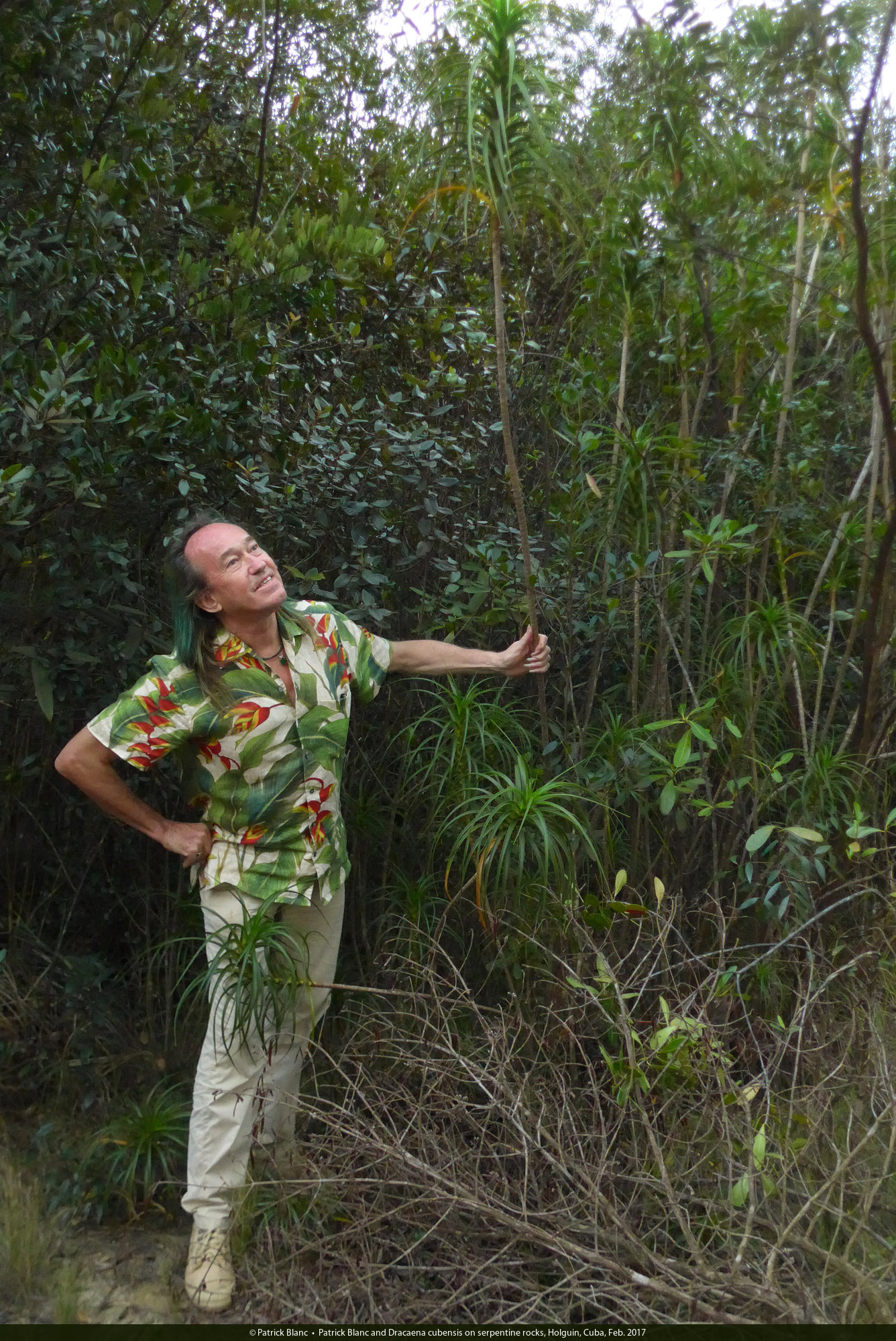 Patrick Blanc and a Dracaena cubensis basally branched individual on serpentine rocks, Holguin, Cuba, Feb. 2017