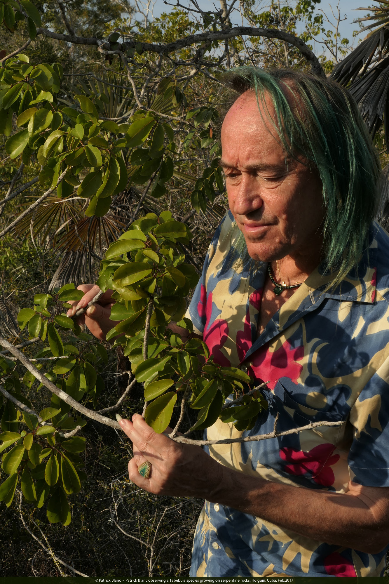 Patrick Blanc observing a Tabebuia species growing on serpentine rocks, Holguin, Cuba, Feb.2017
