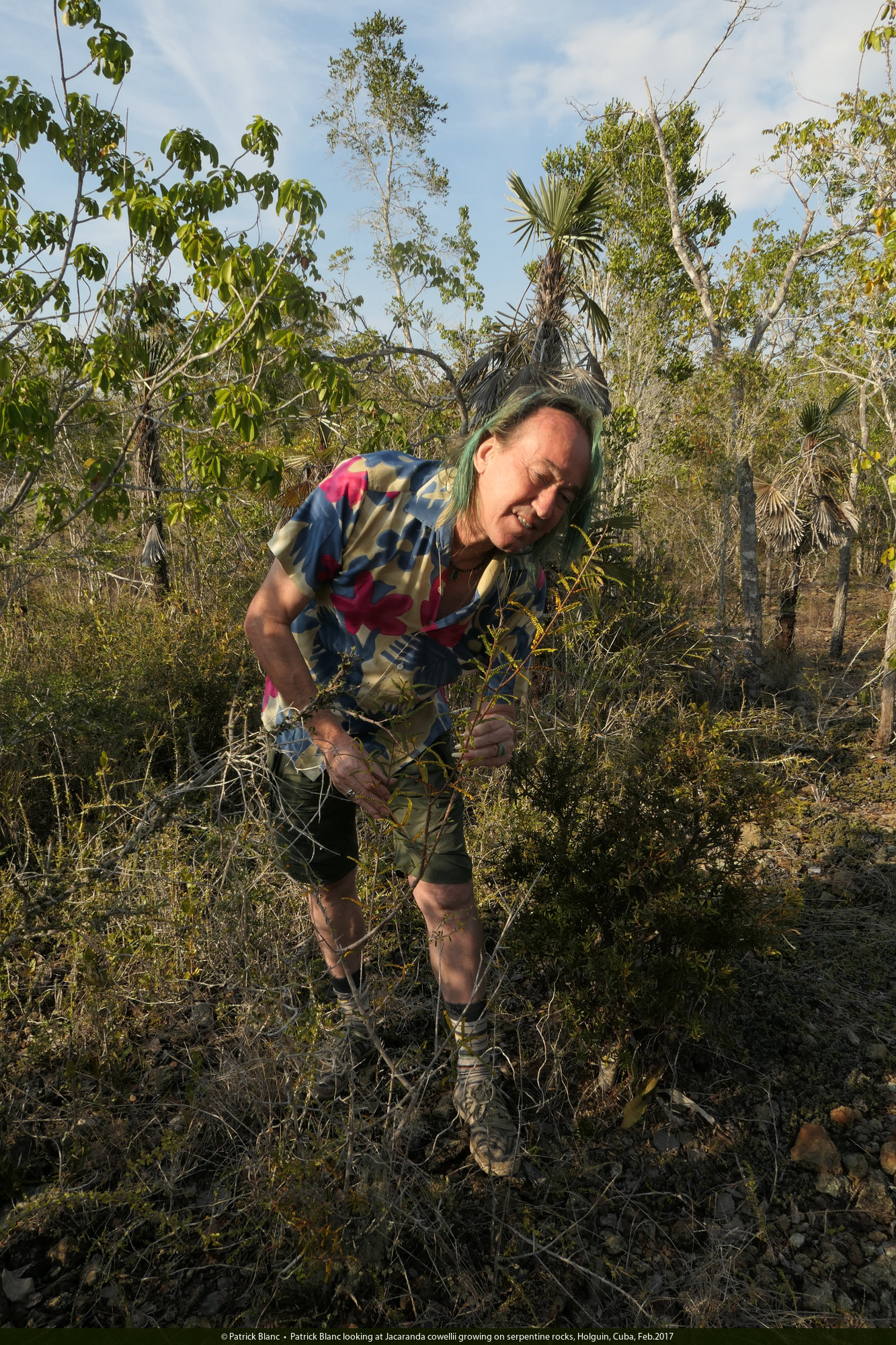 Patrick Blanc looking at Jacaranda cowellii growing on serpentine rocks, Holguin, Cuba, Feb.2017