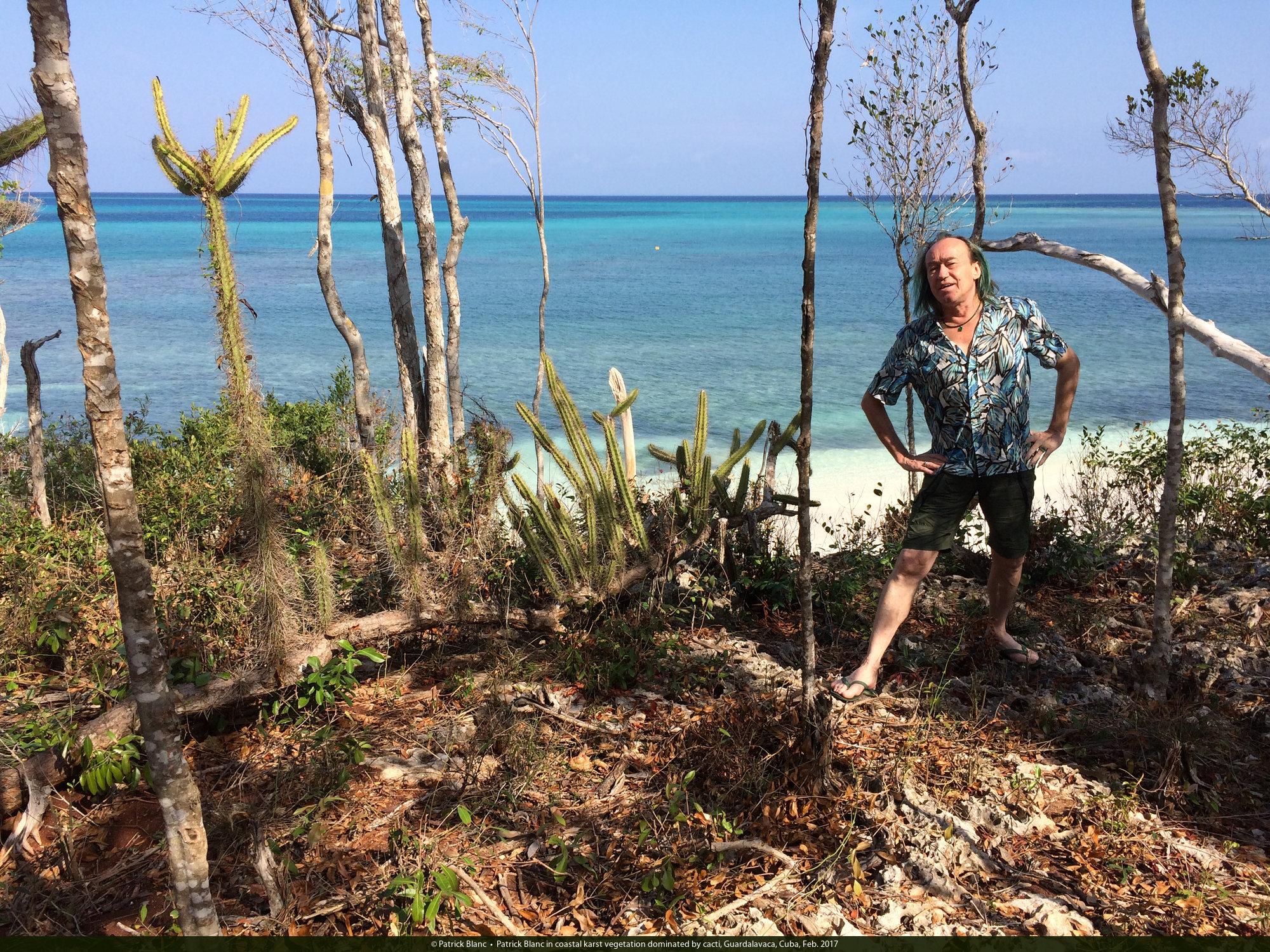 Patrick Blanc in coastal karst vegetation dominated by cacti, Guardalavaca, Cuba, Feb. 2017 [nid: 12683]