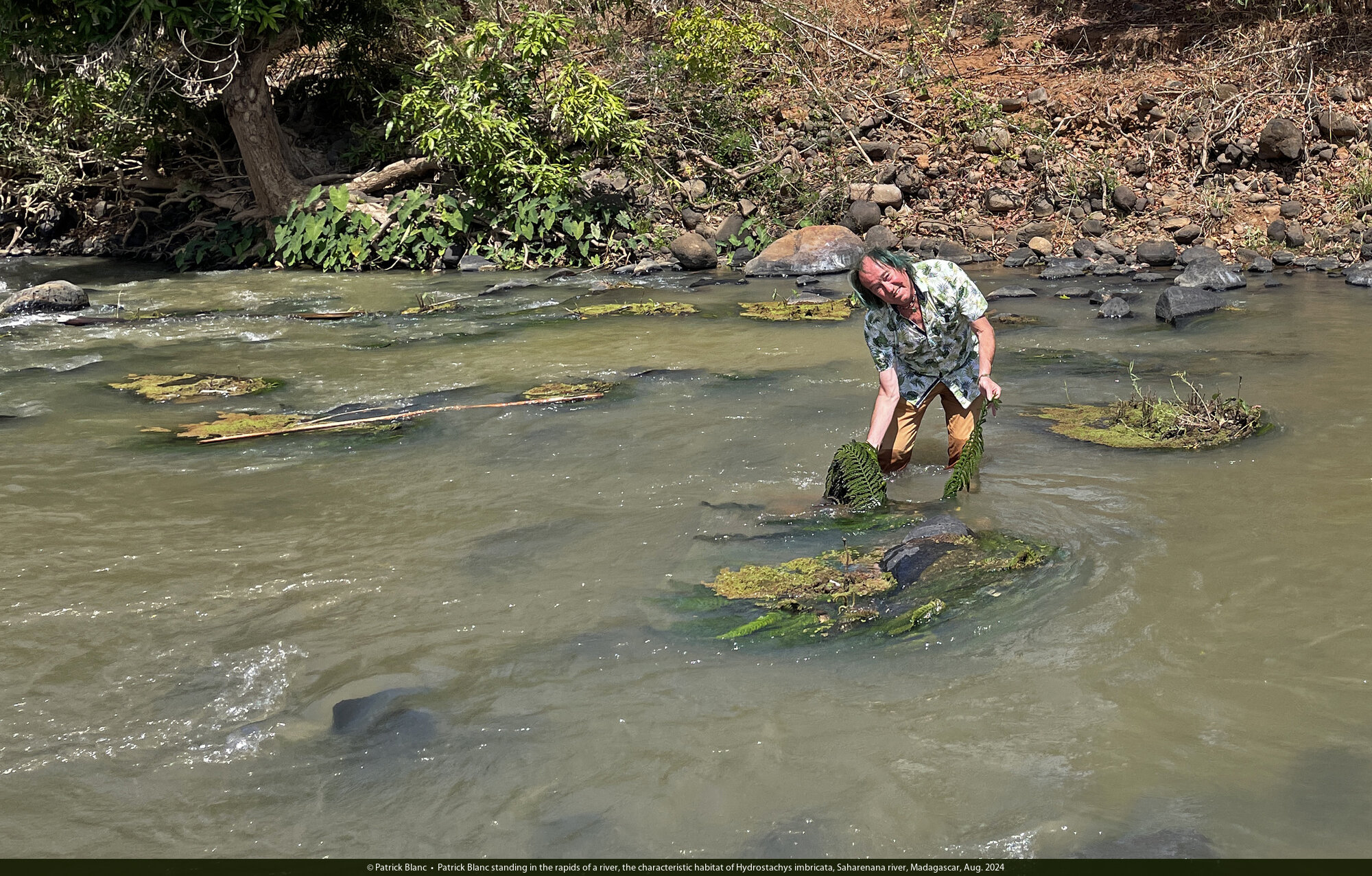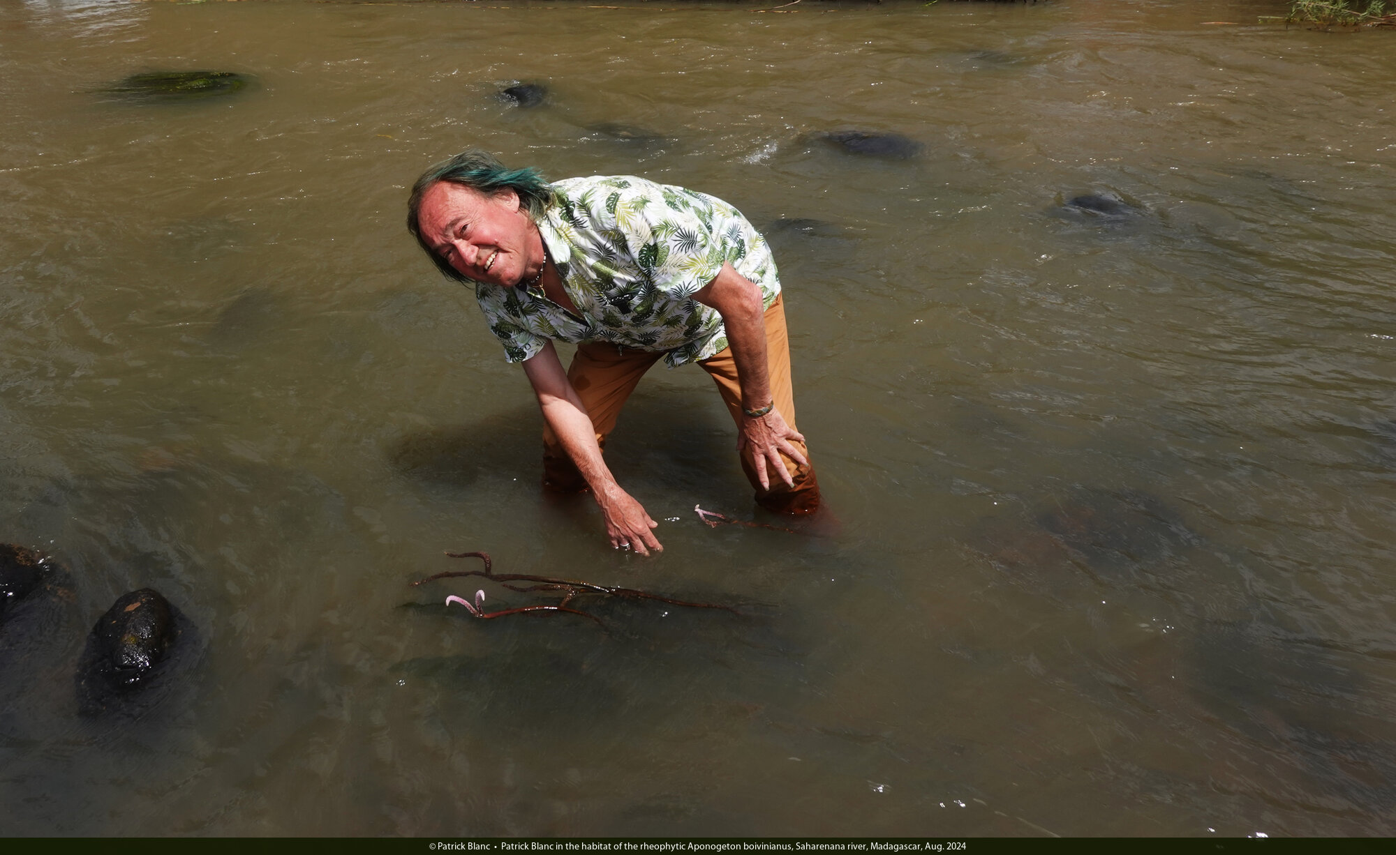 Patrick Blanc in the habitat of the rheophytic Aponogeton boivinianus, Saharenana river, Madagascar, Aug. 2024