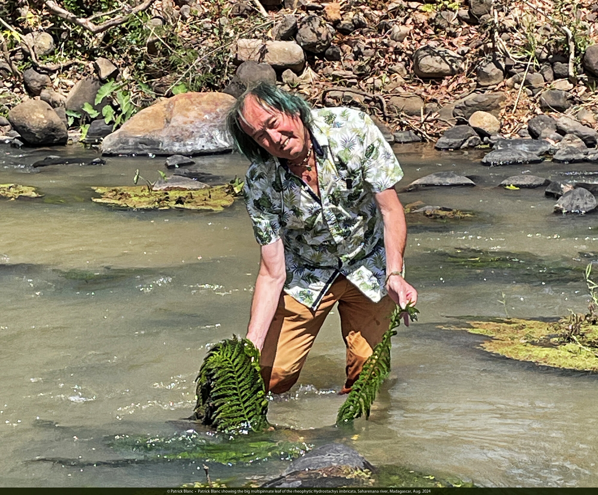 Patrick Blanc showing the multipinnate leaf of the rheophytic Hydrostachys imbricata, Saharenana river, Madagascar, Aug. 2024