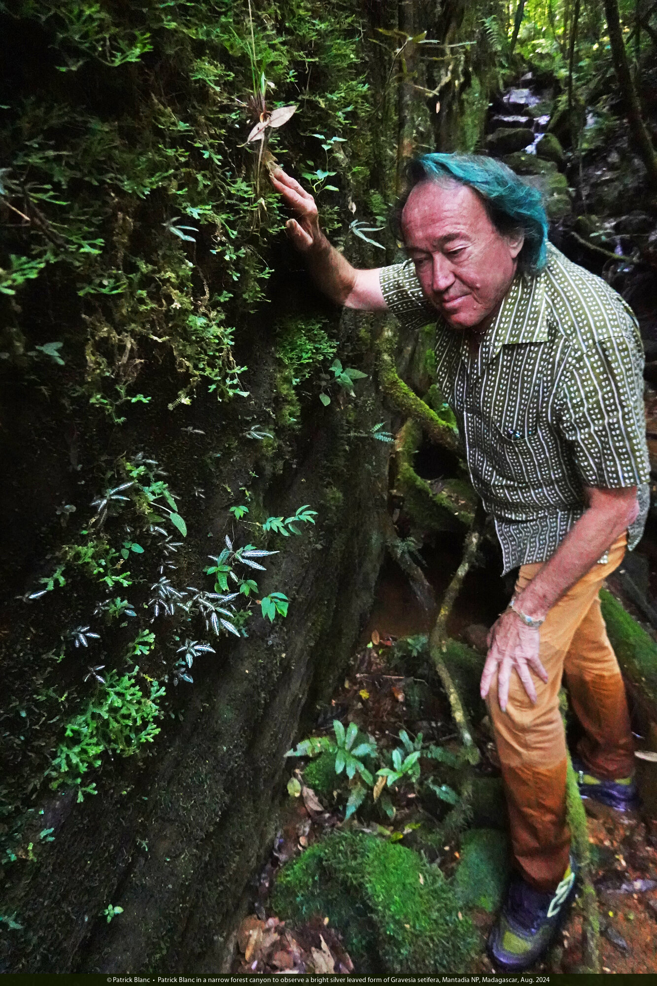 Patrick Blanc in a narrow forest canyon to observe a bright silver leaved form of Gravesia setifera, Mantadia NP, Madagascar, Aug. 2024