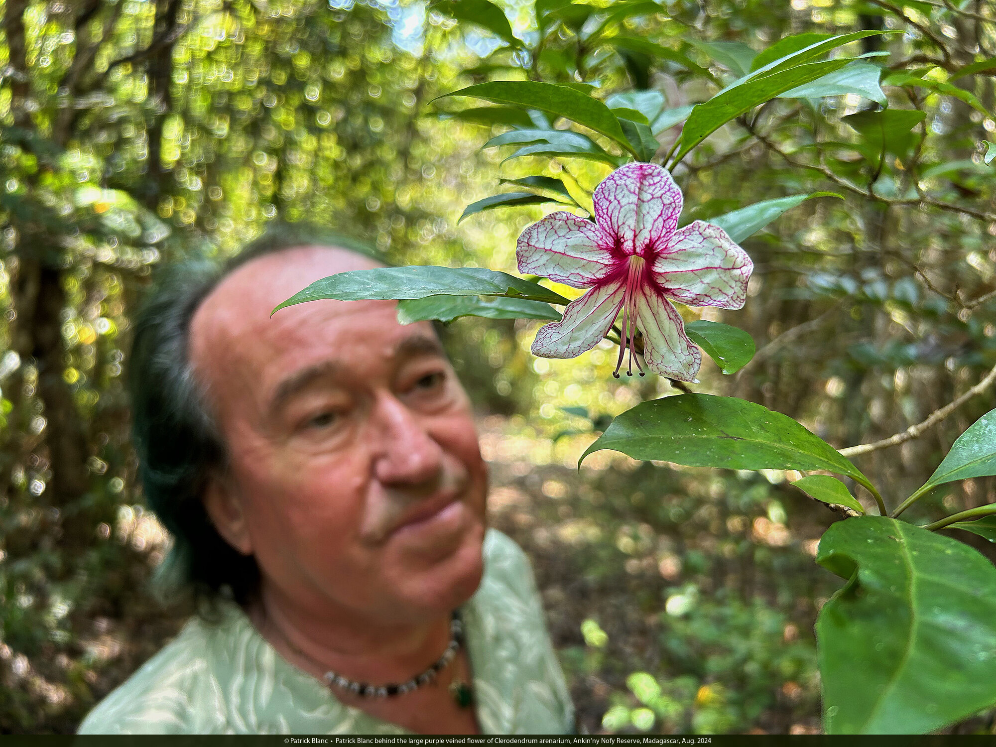 Patrick Blanc behind the large purple veined flower of Clerodendrum arenarium, Ankin'ny Nofy Reserve, Madagascar, Aug. 2024