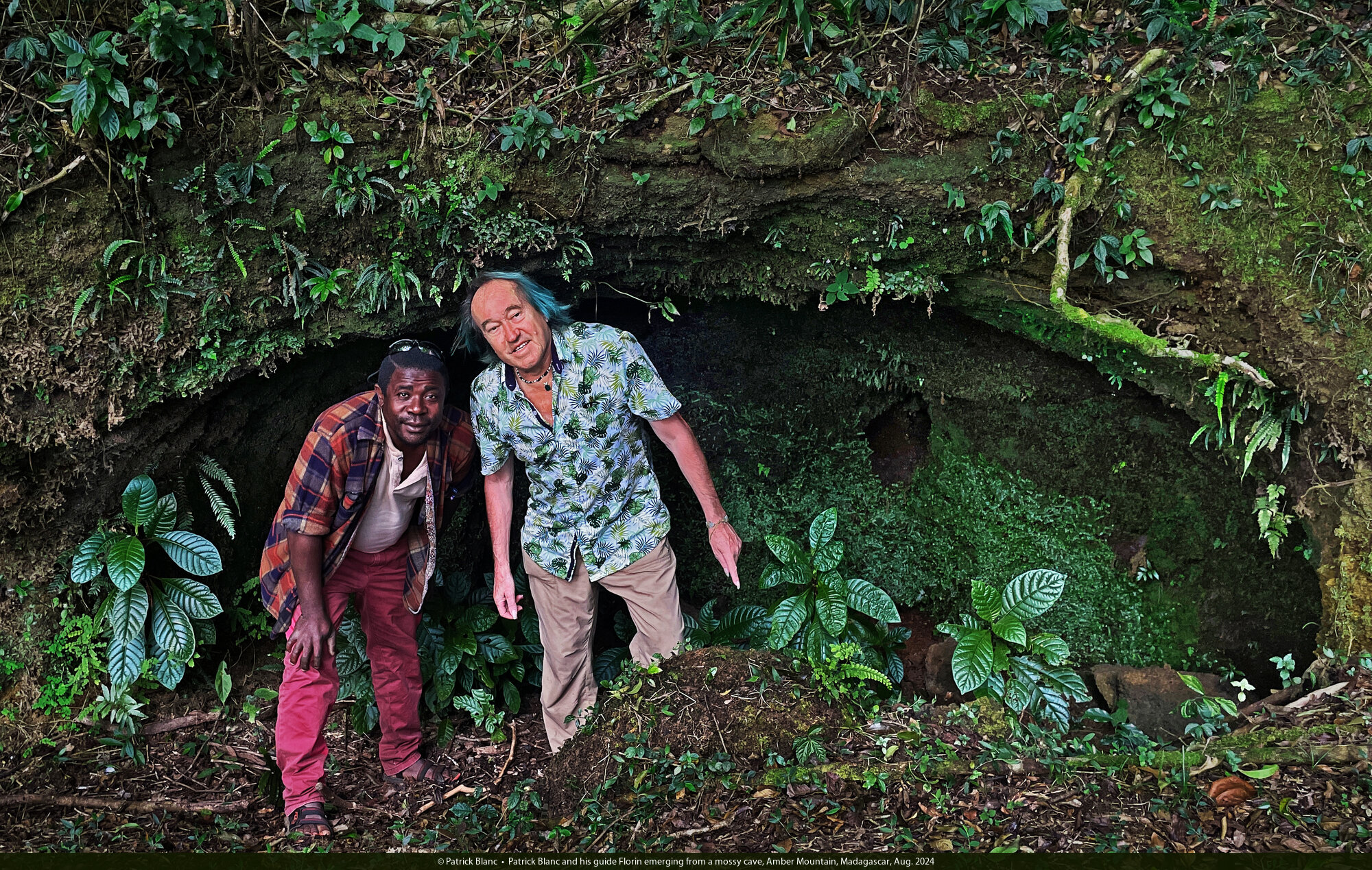Patrick Blanc and his guide Florin emerging from a mossy cave, Amber Mountain, Madagascar, Aug. 2024