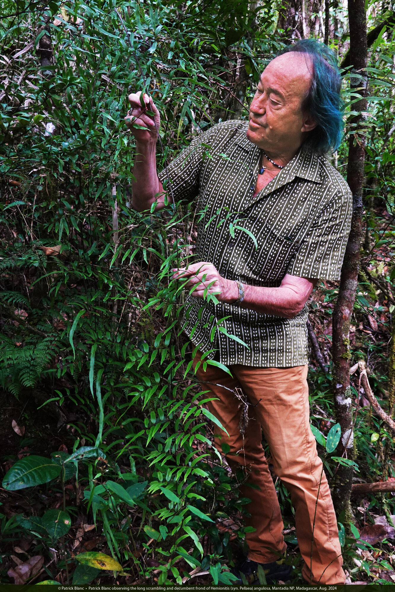 Patrick Blanc observing the long scrambling and decumbent frond of Hemionitis (syn. Pellaea) angulosa, Mantadia NP, Madagascar, Aug. 2024
