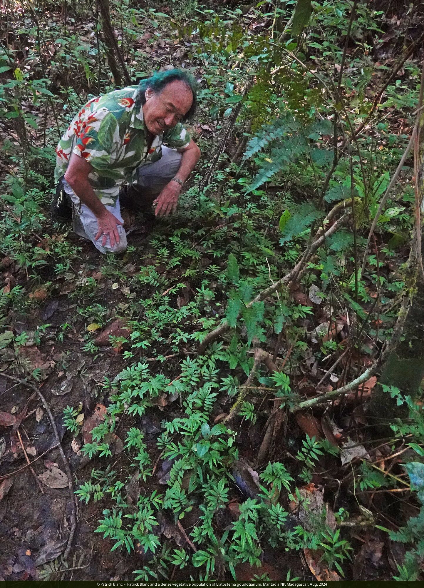 Patrick Blanc and a dense vegetative population of Elatostema goudotianum, Mantadia NP, Madagascar, Aug. 2024