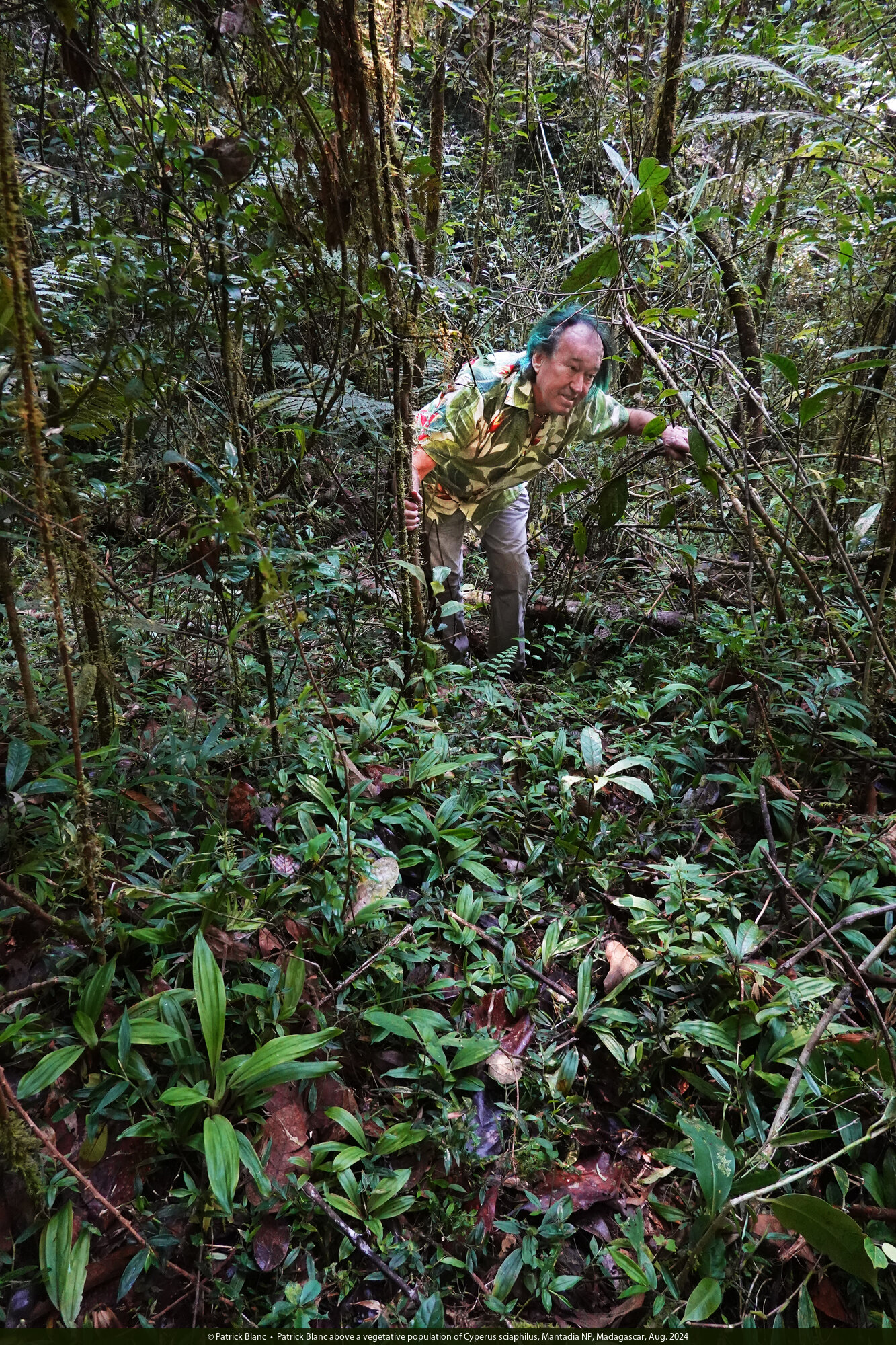 Patrick Blanc observing Cyperus chamaecephalus in forest understory, Montagne d'Ambre, Madagascar, Aug. 2024