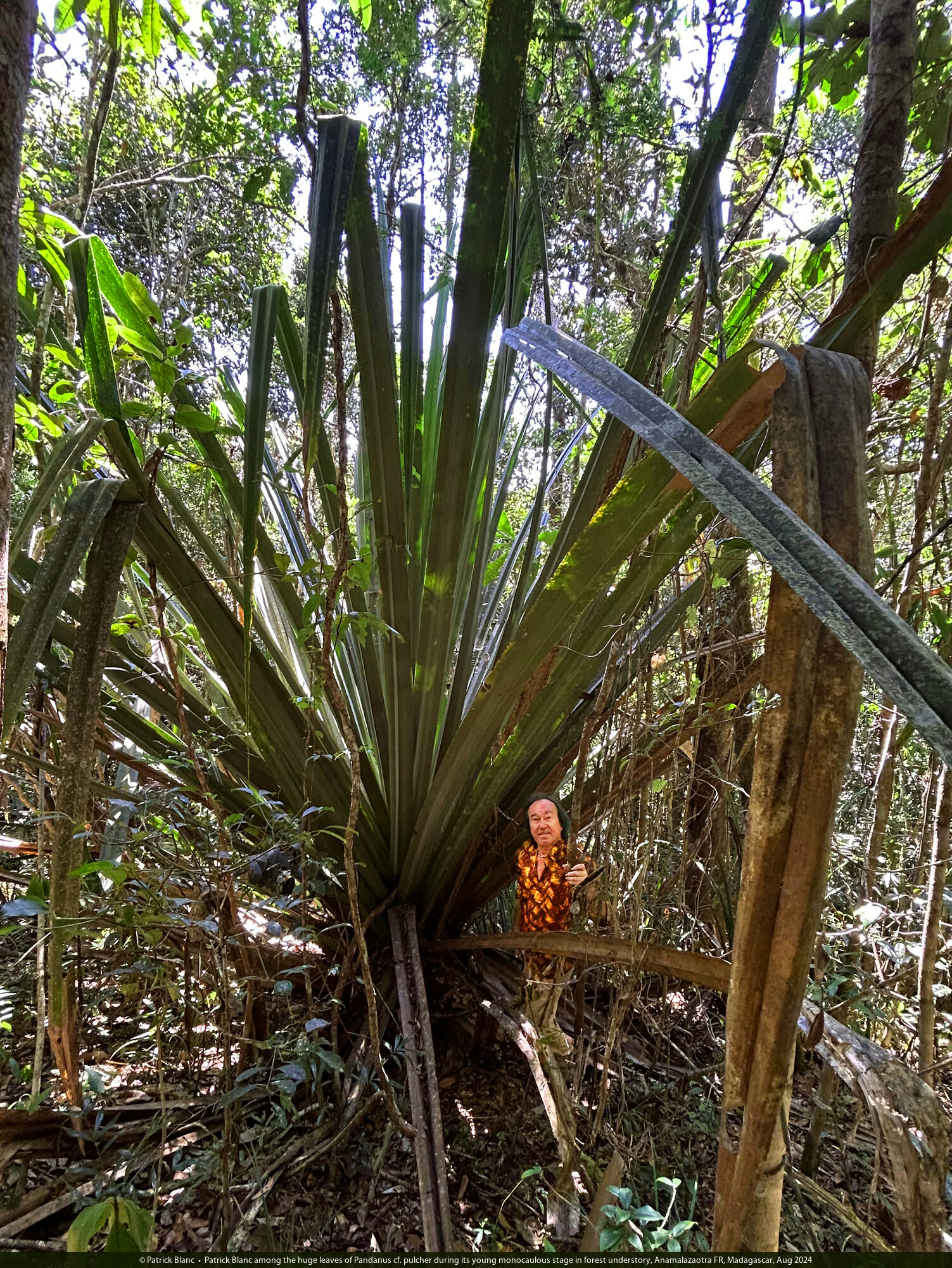 Patrick Blanc among the huge leaves of Pandanus cf. pulcher during its young monocaulous stage in forest understory, Anamalazaotra FR, Madagascar, Aug 2024