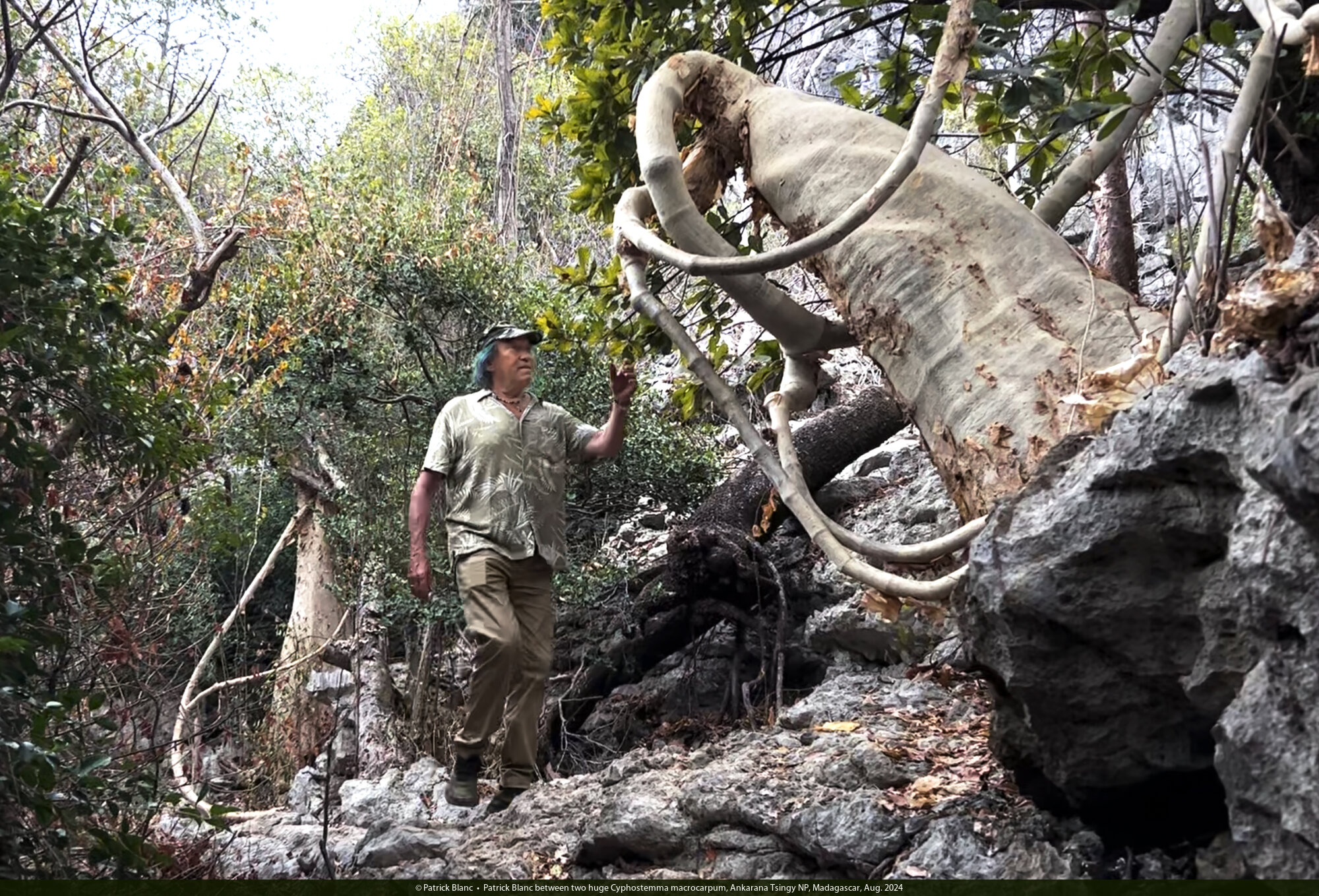 Patrick Blanc between two huge Cyphostemma macrocarpum, Ankarana Tsingy NP, Madagascar, Aug. 2024