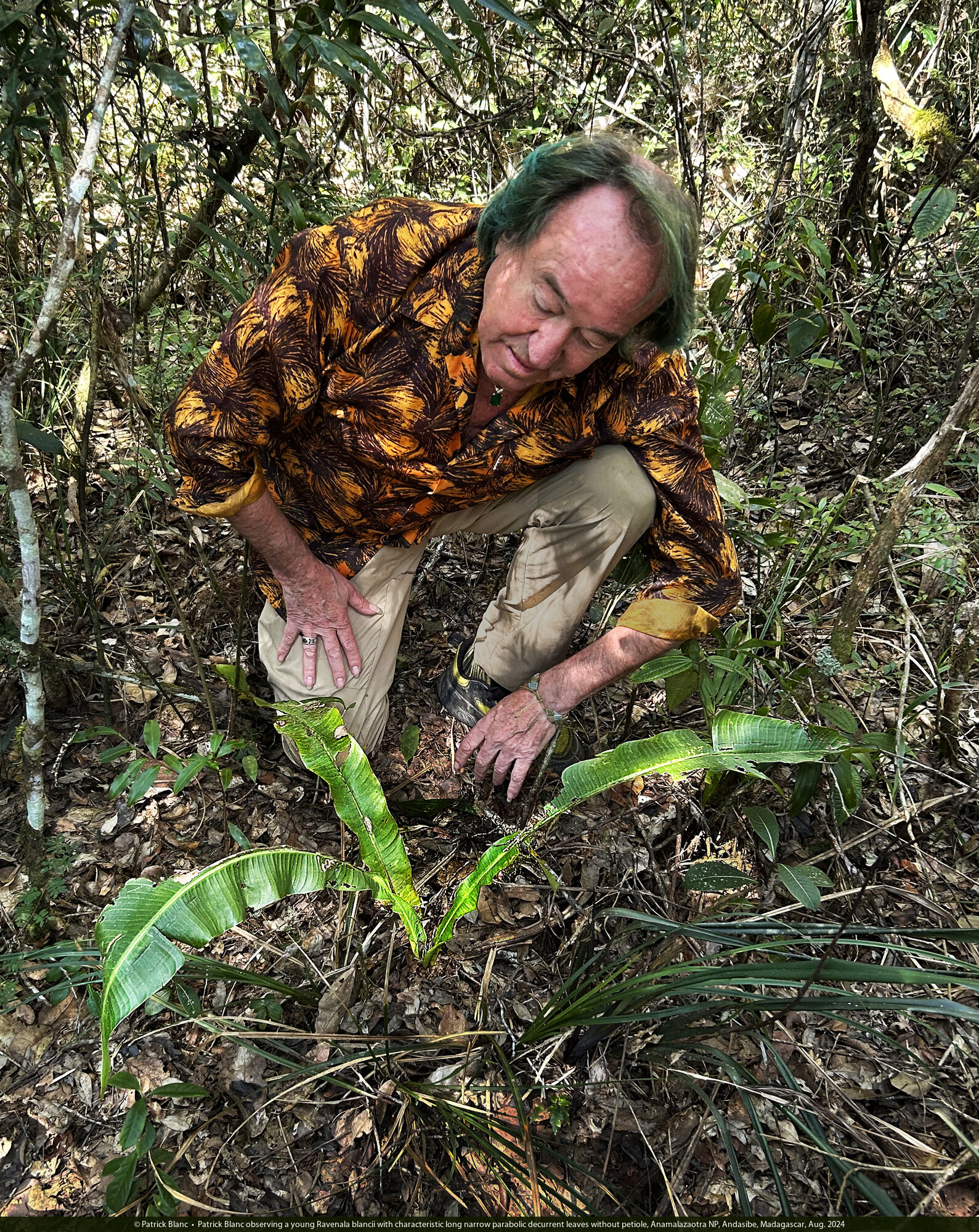 Patrick Blanc observing a young Ravenala blancii with characteristic long narrow parabolic decurrent leaves without petiole, Anamalazaotra NP, Andasibe, Madagascar, Aug. 2024