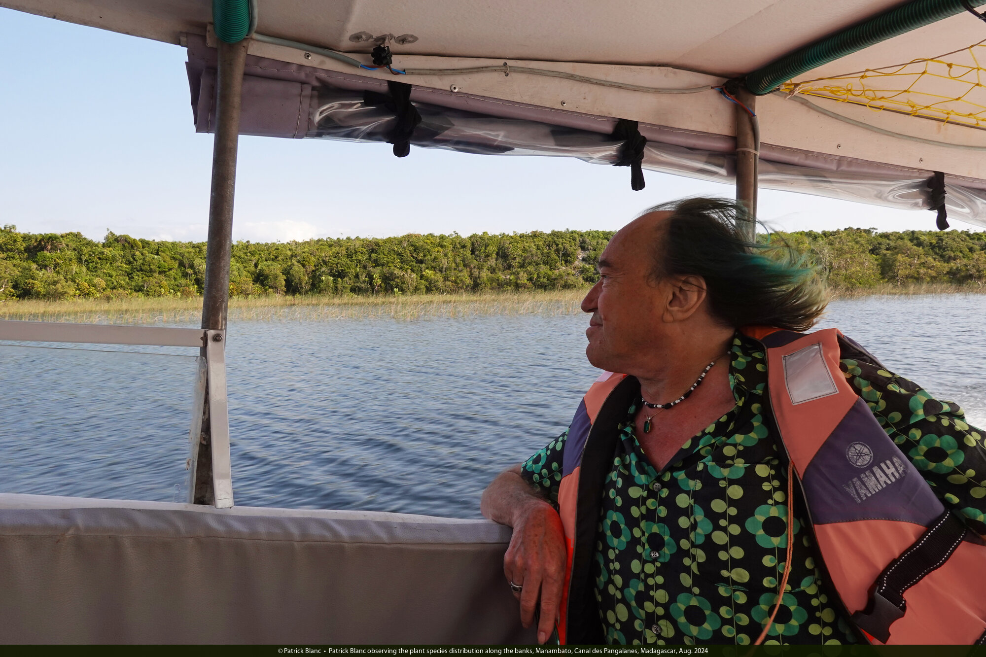 Patrick Blanc observing the plant species distribution along the banks, Manambato, Canal des Pangalanes, Madagascar, Aug. 2024