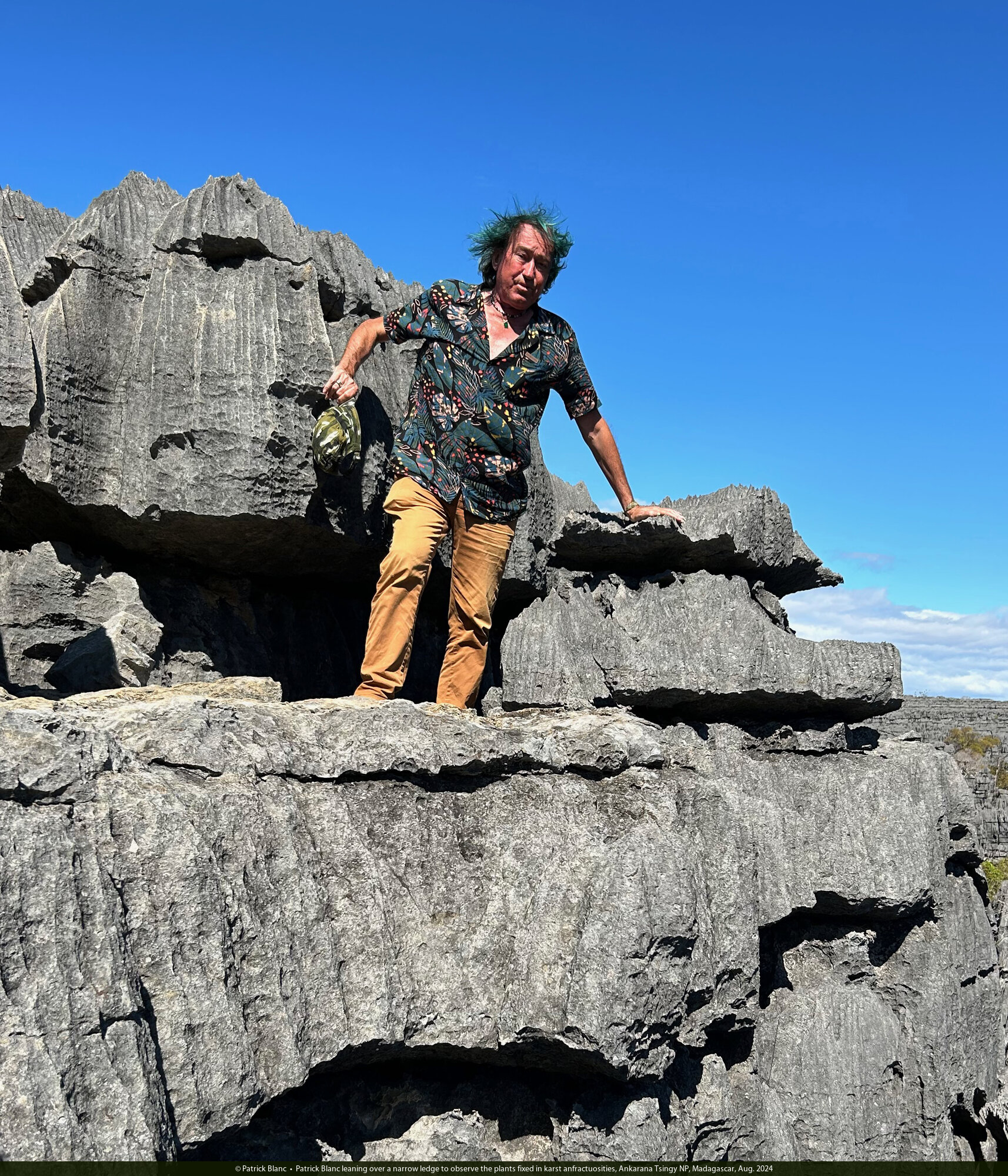 Patrick Blanc standing on a narrow karst ledge, Ankarana Tsingy NP, Madagascar, Aug. 2024