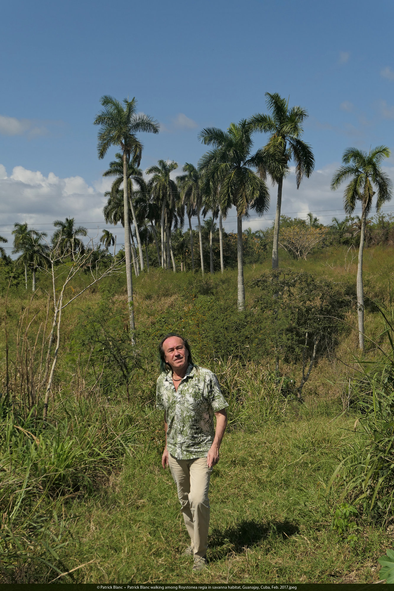Patrick Blanc walking among Roystonea regia in savanna habitat, Guanajay, Cuba, Feb. 2017.jpeg