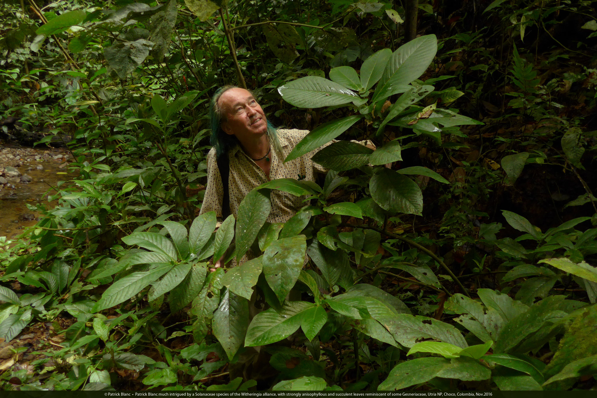 Patrick Blanc much intrigued by a Solanaceae species of the Witheringia alliance, with strongly anisophyllous and succulent leaves reminiscent of some Gesneriaceae, Utria NP, Choco, Colombia, Nov.2016