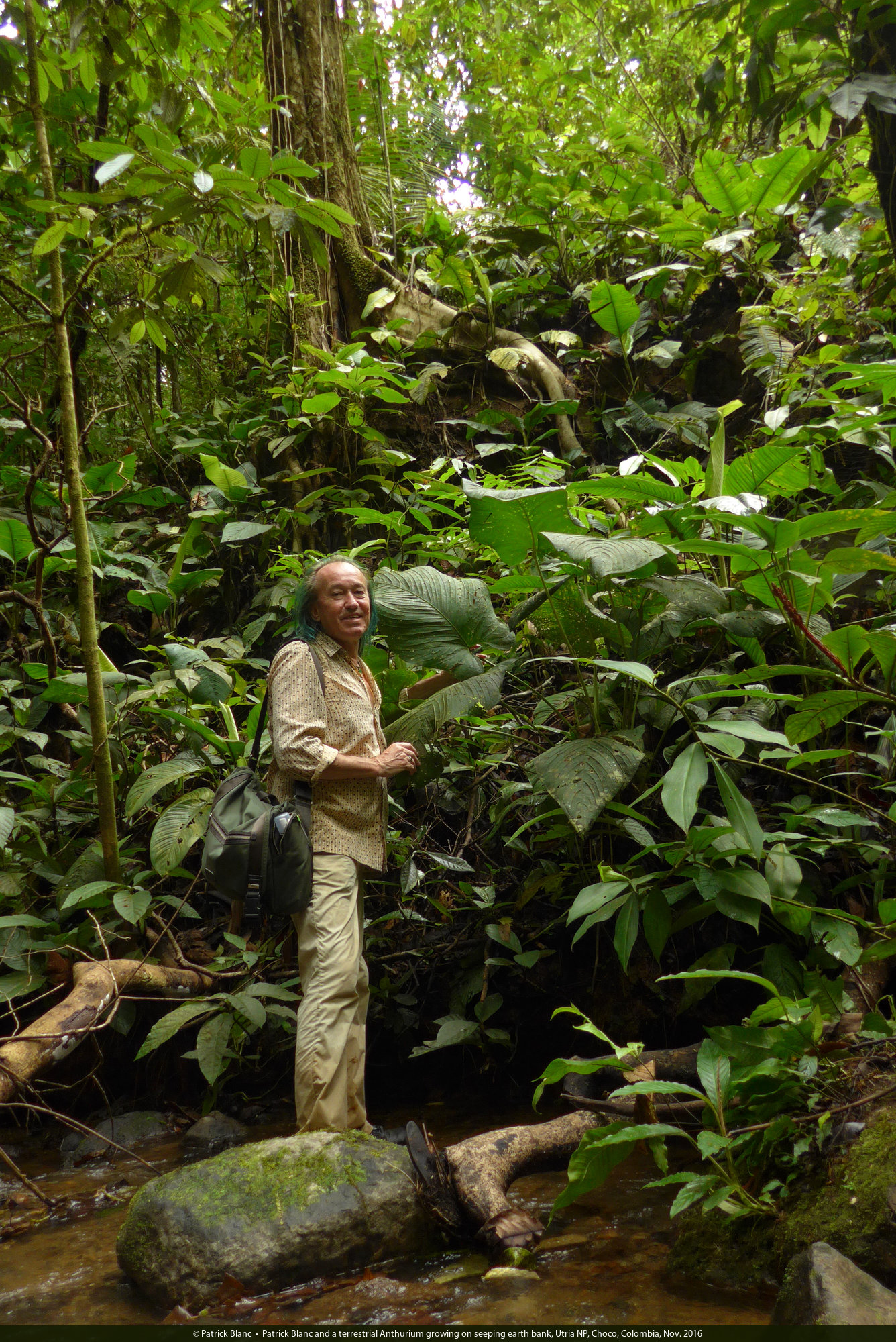 Patrick Blanc and a terrestrial Anthurium growing on seeping earth bank, Utria NP, Choco, Colombia, Nov. 2016