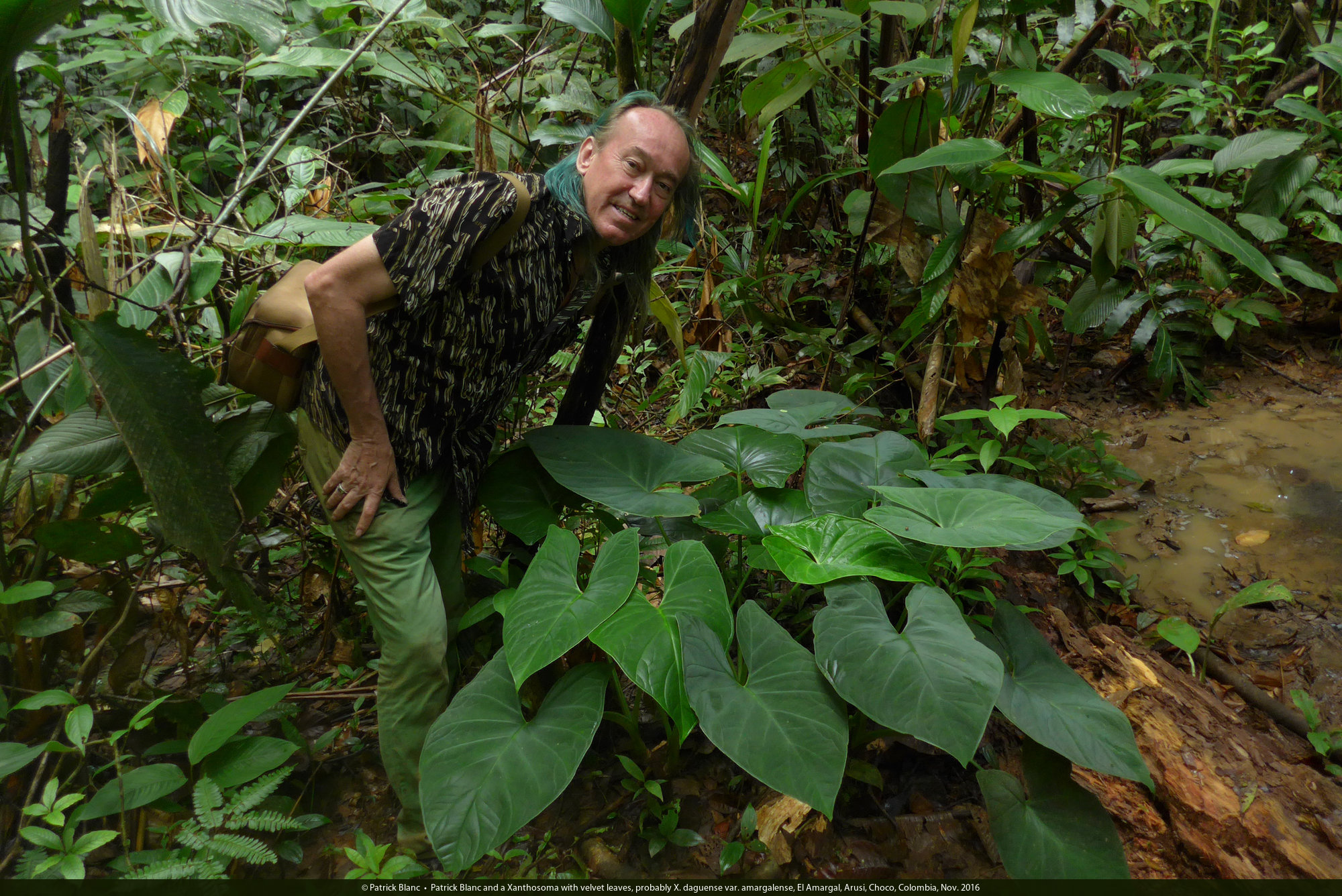 Patrick Blanc intrigued by a big Spathiphyllum with unusually Dieffenbachia like developped erect stem stem with long internodes, Utria NP, Choco, Colombia, Nov. 2016