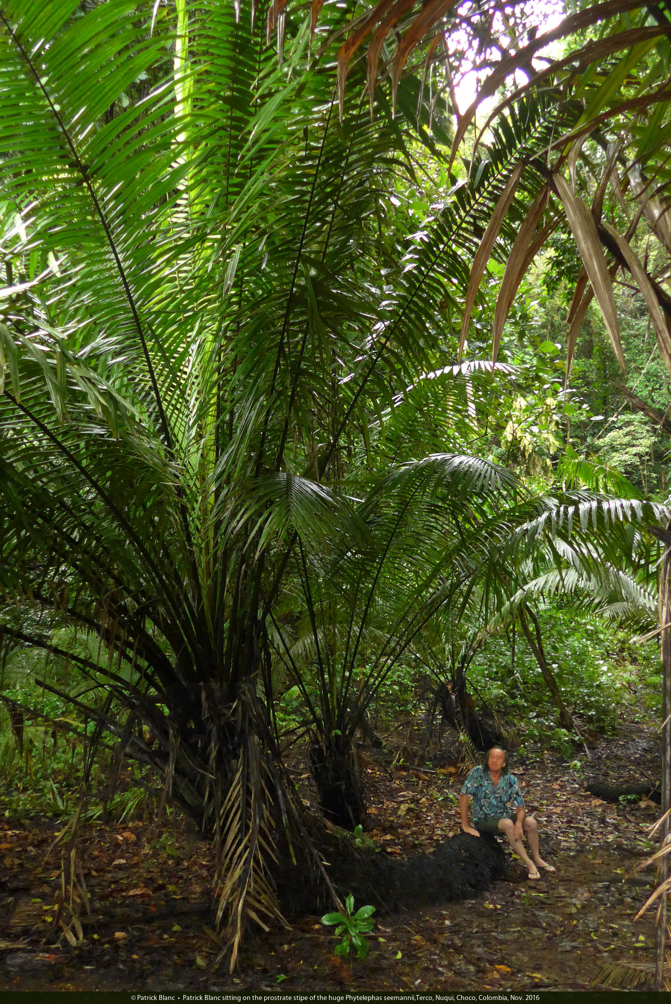 Patrick Blanc sitting on the prostrate stipe of the huge Phytelephas seemannii,Terco, Nuqui, Choco, Colombia, Nov. 2016