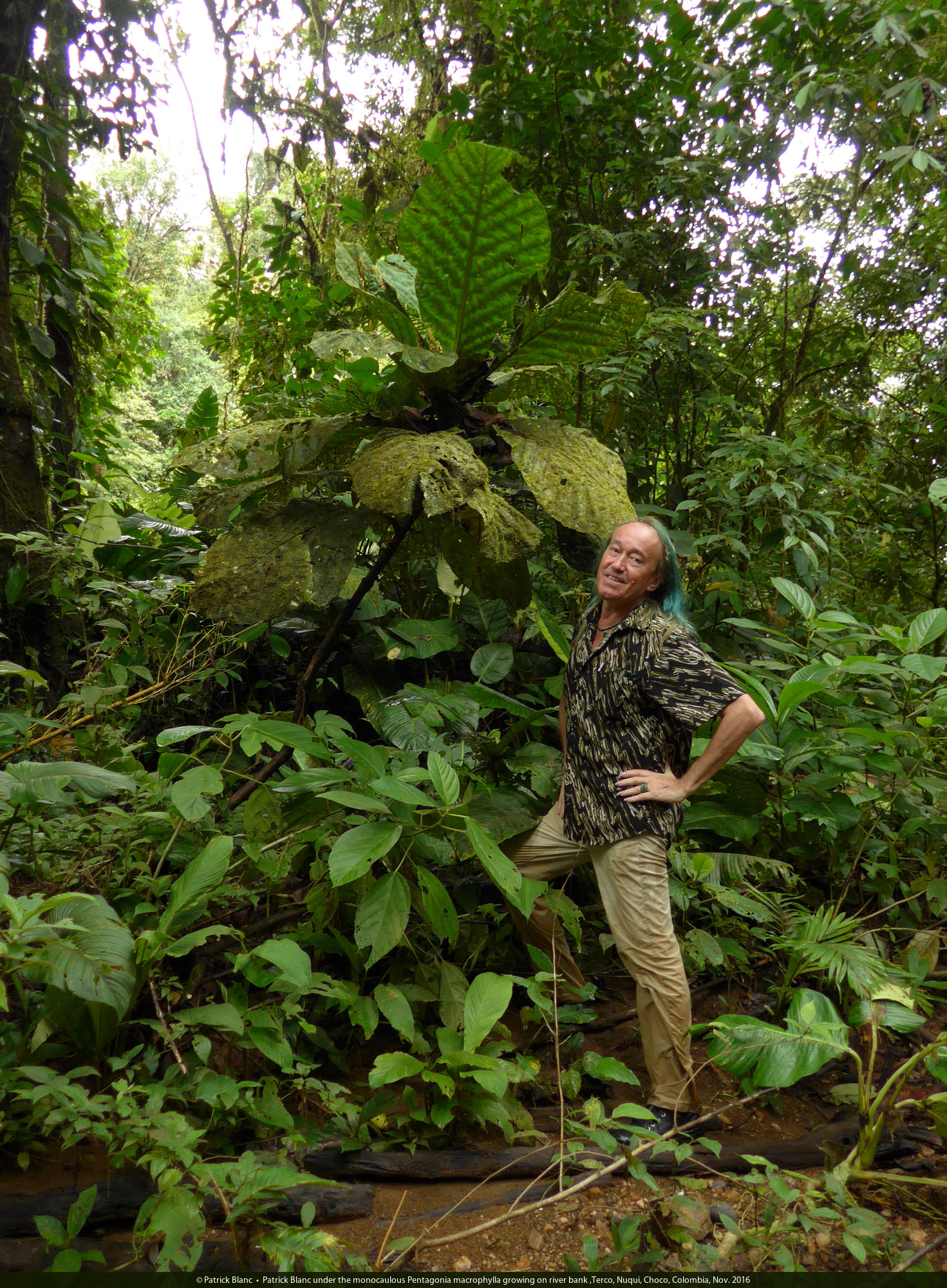 Patrick Blanc under the monocaulous Pentagonia macrophylla whose old huge leaves ae totally covered by epiphylls such as algae, mosses and liverworts,Terco, Nuqui, Choco, Colombia, Nov. 2016