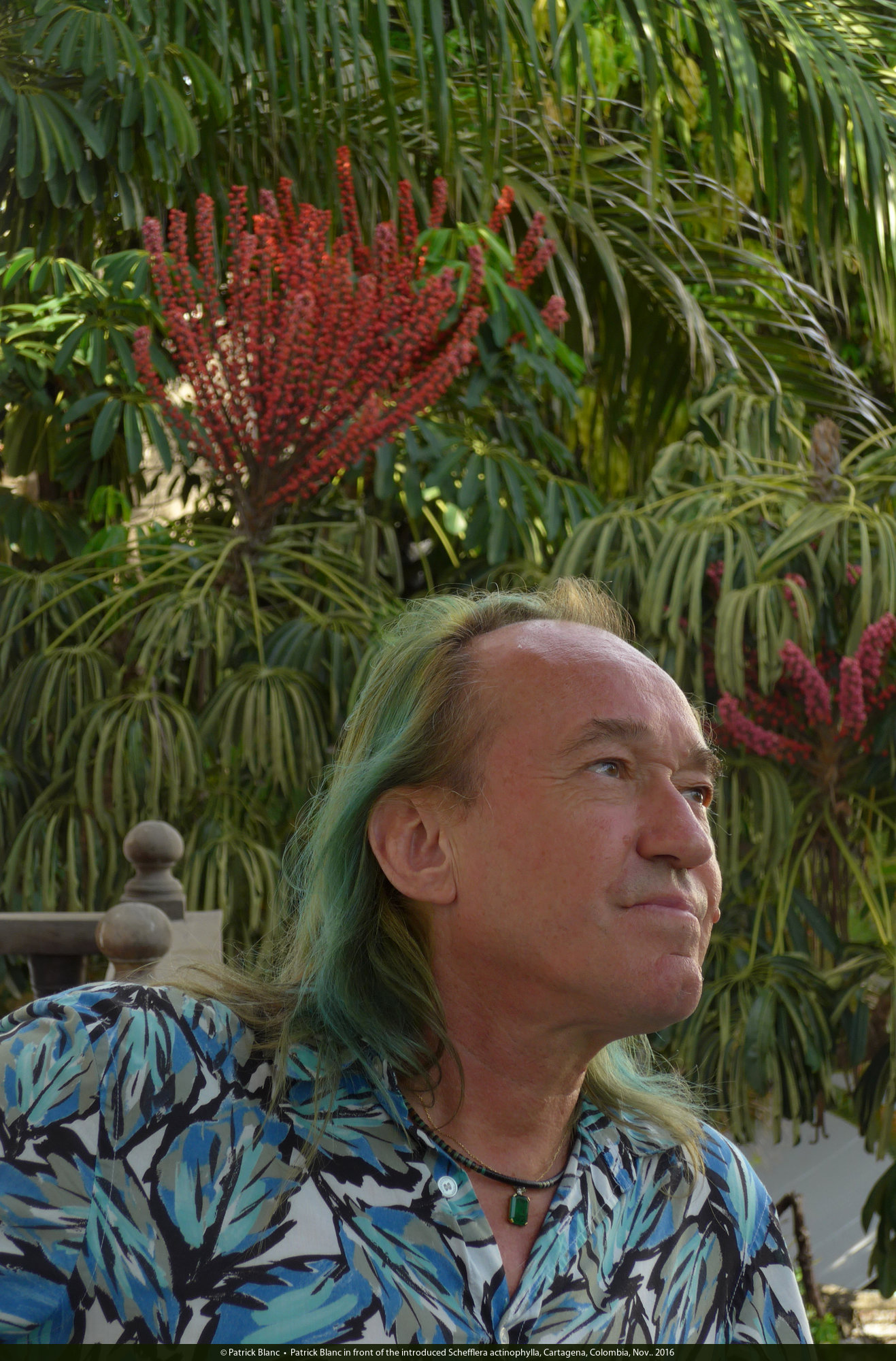Patrick Blanc and the introduced Schefflera actinophylla, Cartagena, Colombia, Nov.. 2016