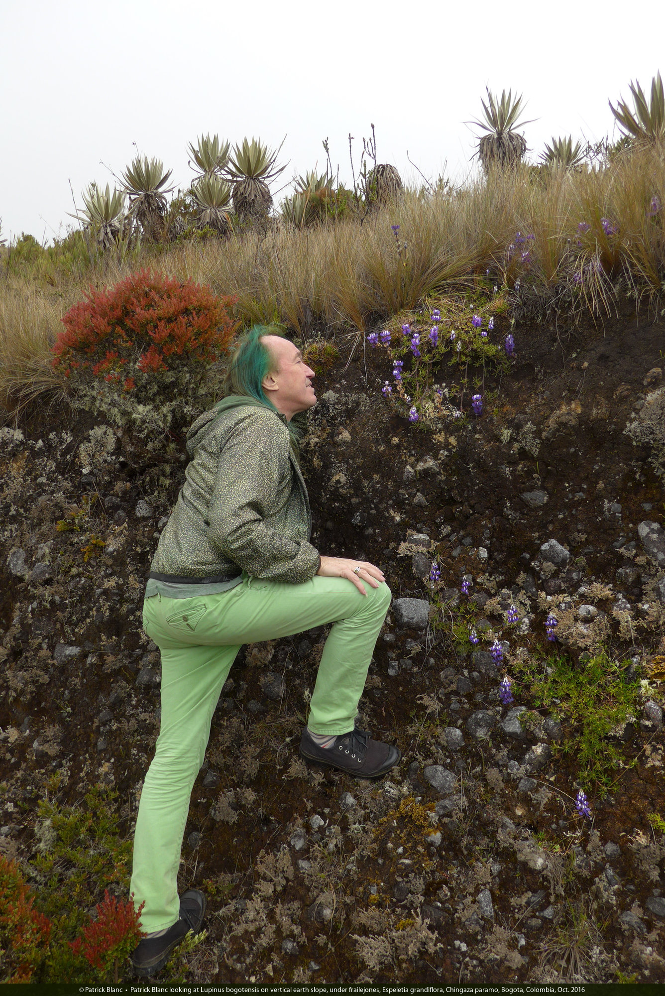 Patrick Blanc looking at Lupinus bogotensis on vertical earth slope, under frailejones, Espeletia grandiflora, Chingaza paramo, Bogota, Colombia, Oct. 2016
