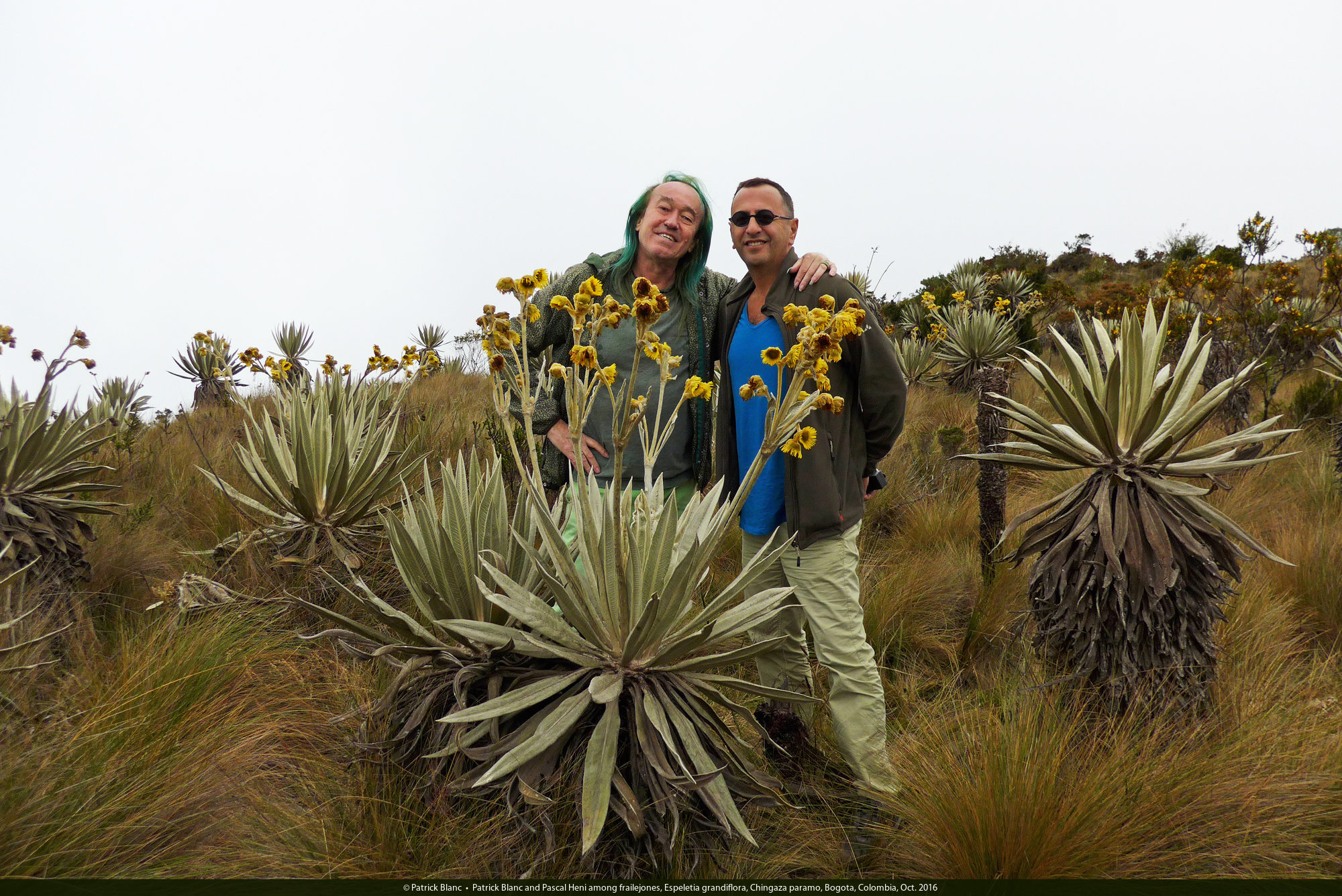 Patrick Blanc and Pascal Heni among frailejones, Espeletia grandiflora, Chingaza paramo, Bogota, Colombia, Oct. 2016