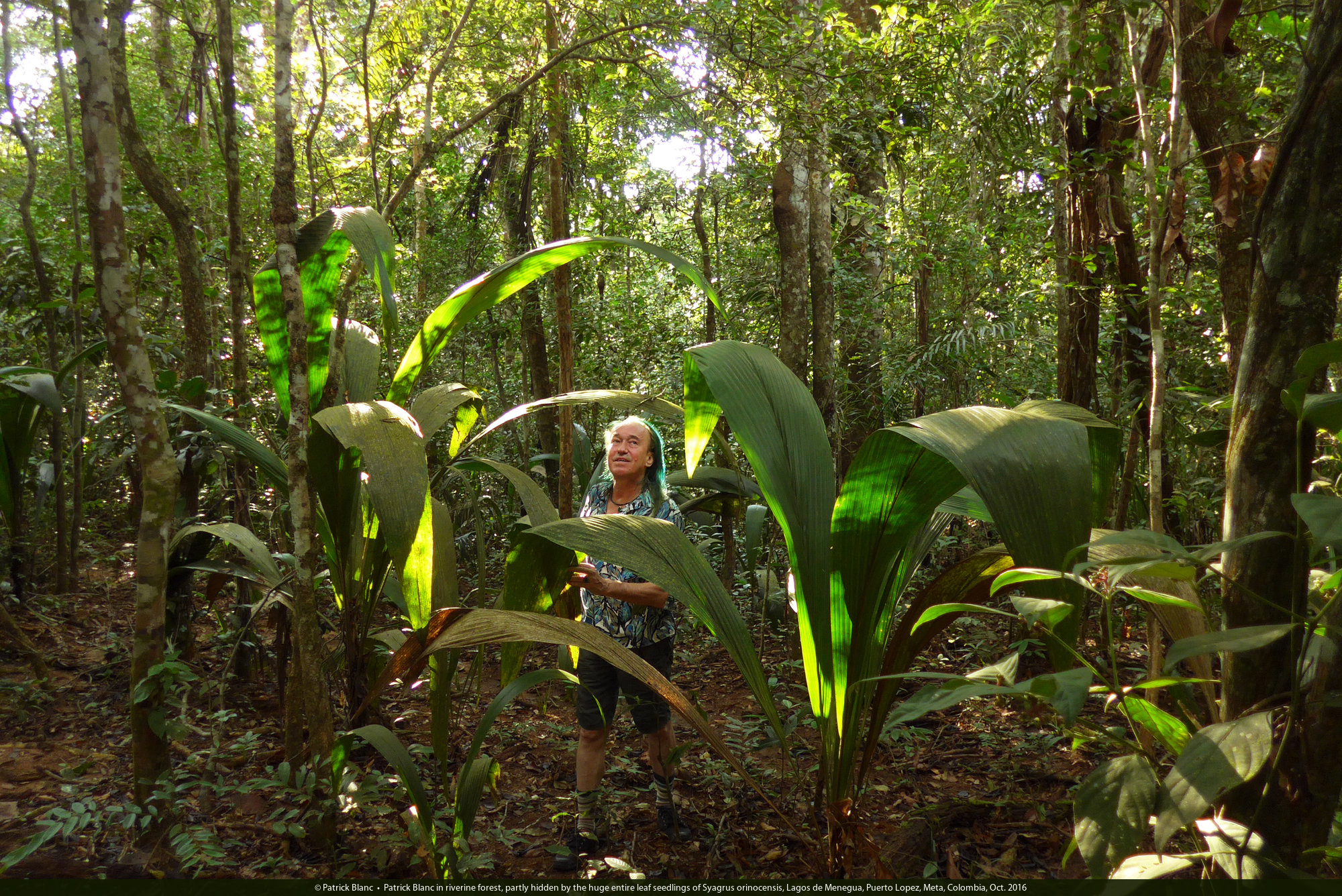 Patrick Blanc in riverine forest, partly hidden by the huge entire leaf seedlings of Syagrus orinocensis, Lagos de Menegua, Puerto Lopez, Meta, Colombia, Oct. 2016