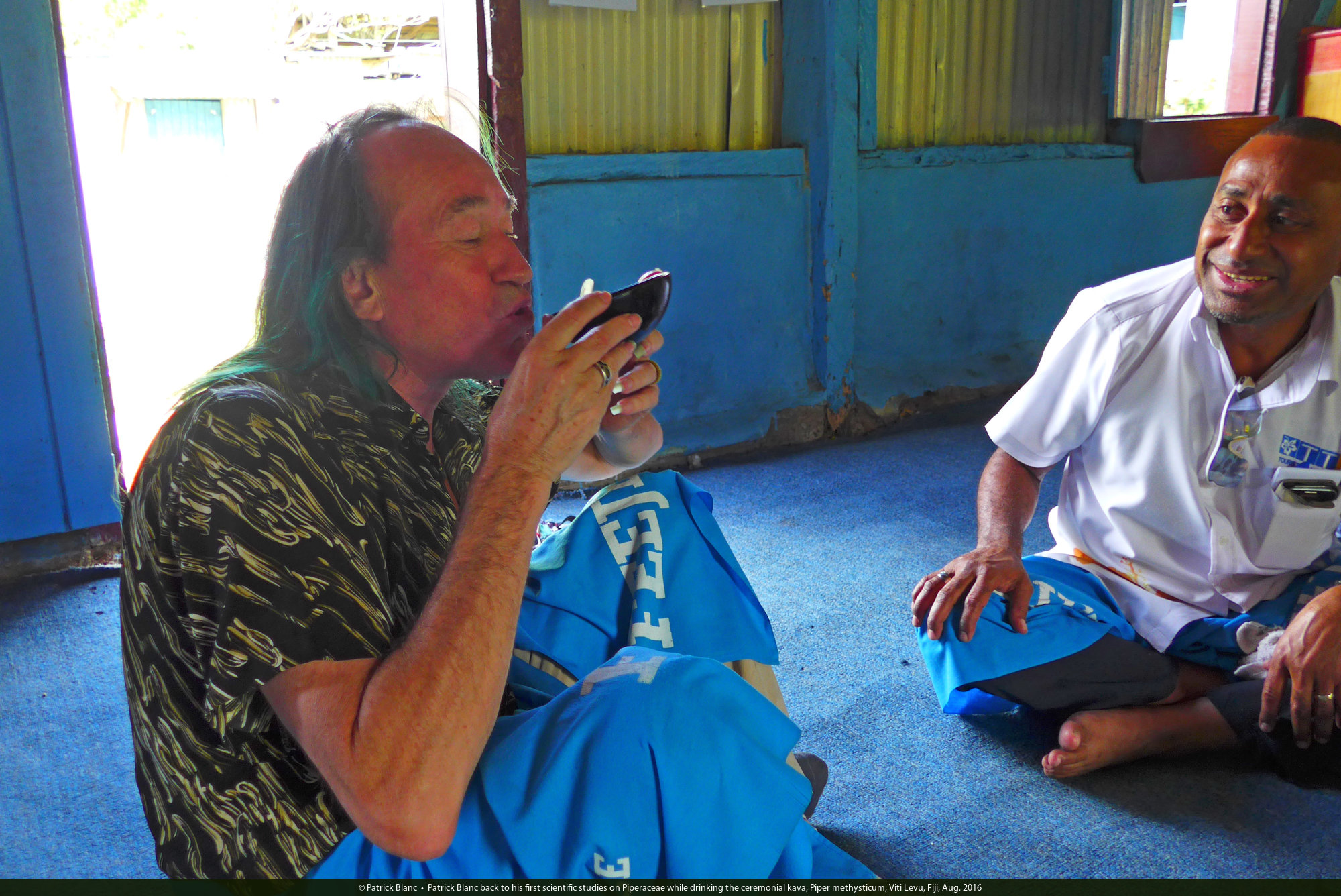 Patrick Blanc back to his first scientific studies on Piperaceae while drinking the ceremonial kava, Piper methysticum, Viti Levu, Fiji, Aug. 2016