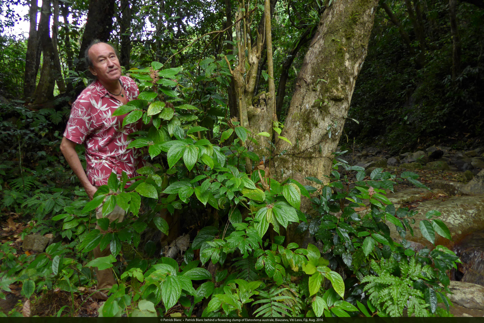 Patrick Blanc behind a flowering clump of Elatostema australe, Biausevu, Viti Levu, Fiji, Aug. 2016