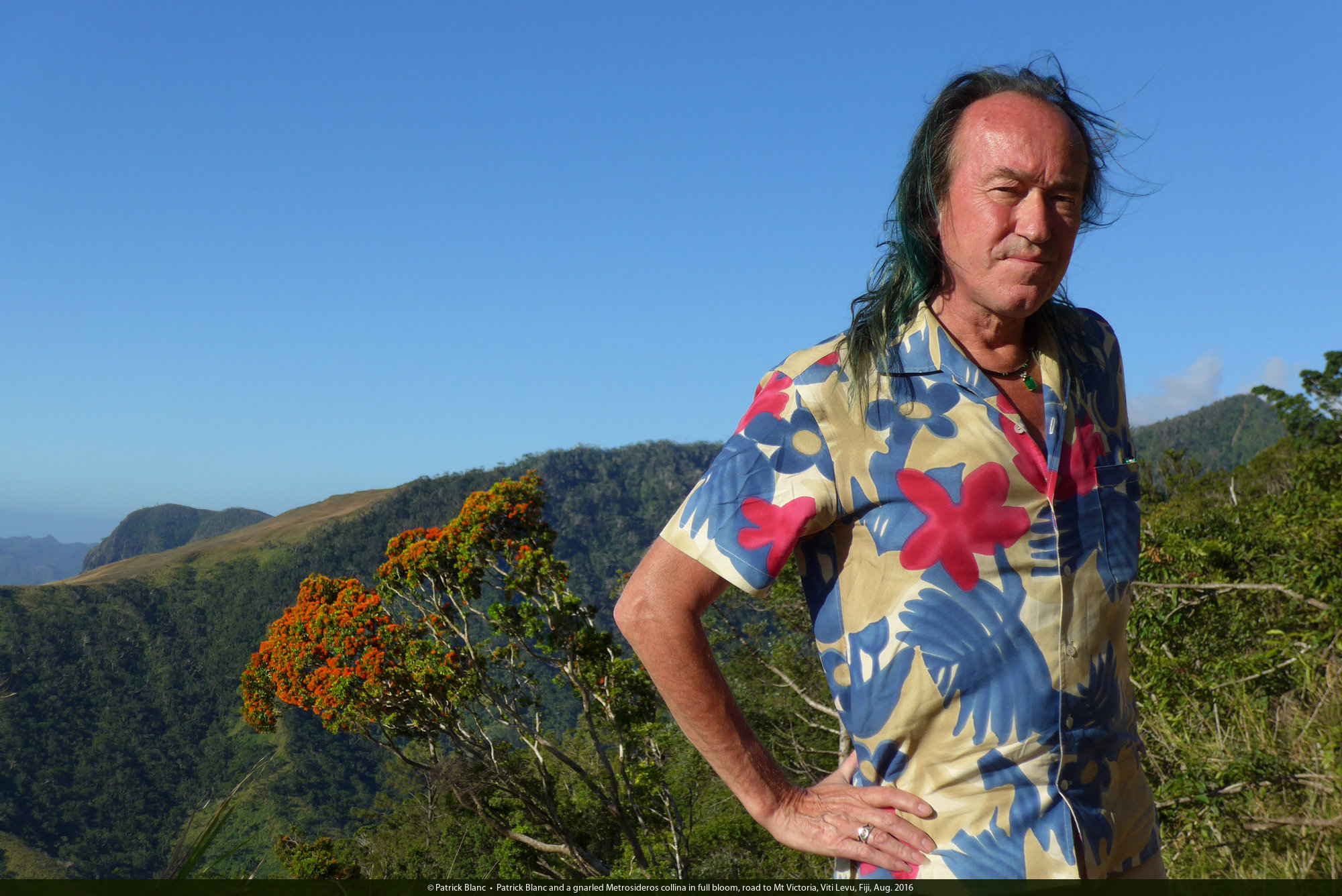 Patrick Blanc and Metrosideros collina in full bloom, road to Mt Victoria, Viti Levu, Fiji, Aug. 2016