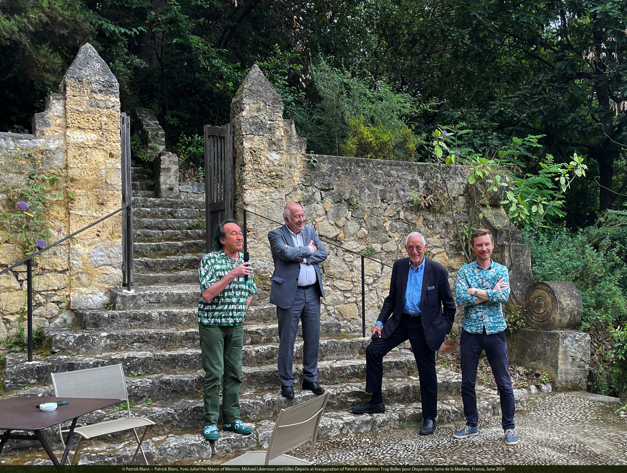 Patrick Blanc, Yves Juhel the Mayor of Menton, Michael Likierman and Gilles Deparis at Inauguration of Patrick's exhibition Trop Belles pour Disparaitre, Serre de la Madone, France, June 2024