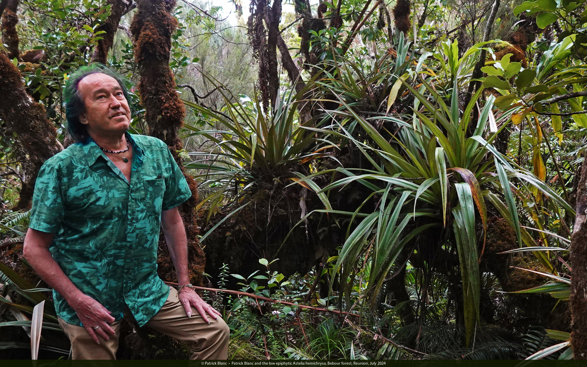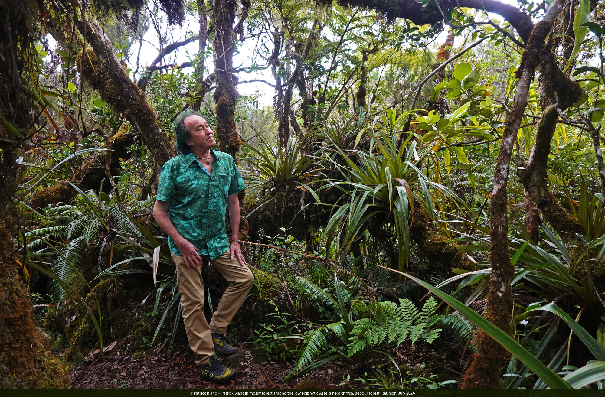 Patrick Blanc and the low epiphytic Astelia hemichrysa, Bebour forest, Reunion, July 2024