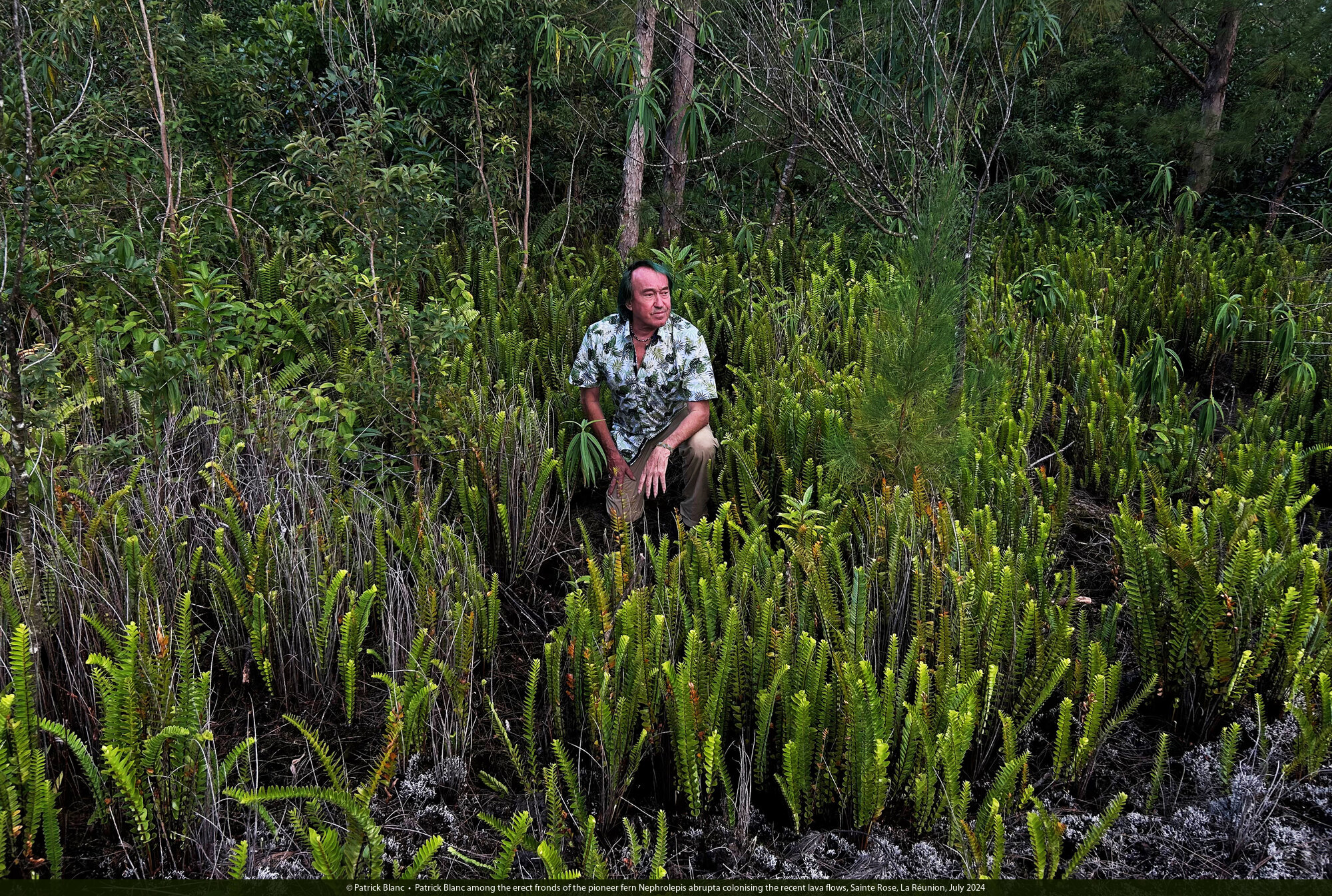 Patrick Blanc among the erect fronds of the pioneer fern Nephrolepis abrupta colonising the recent lava flows, Sainte Rose, La Réunion, July 2024