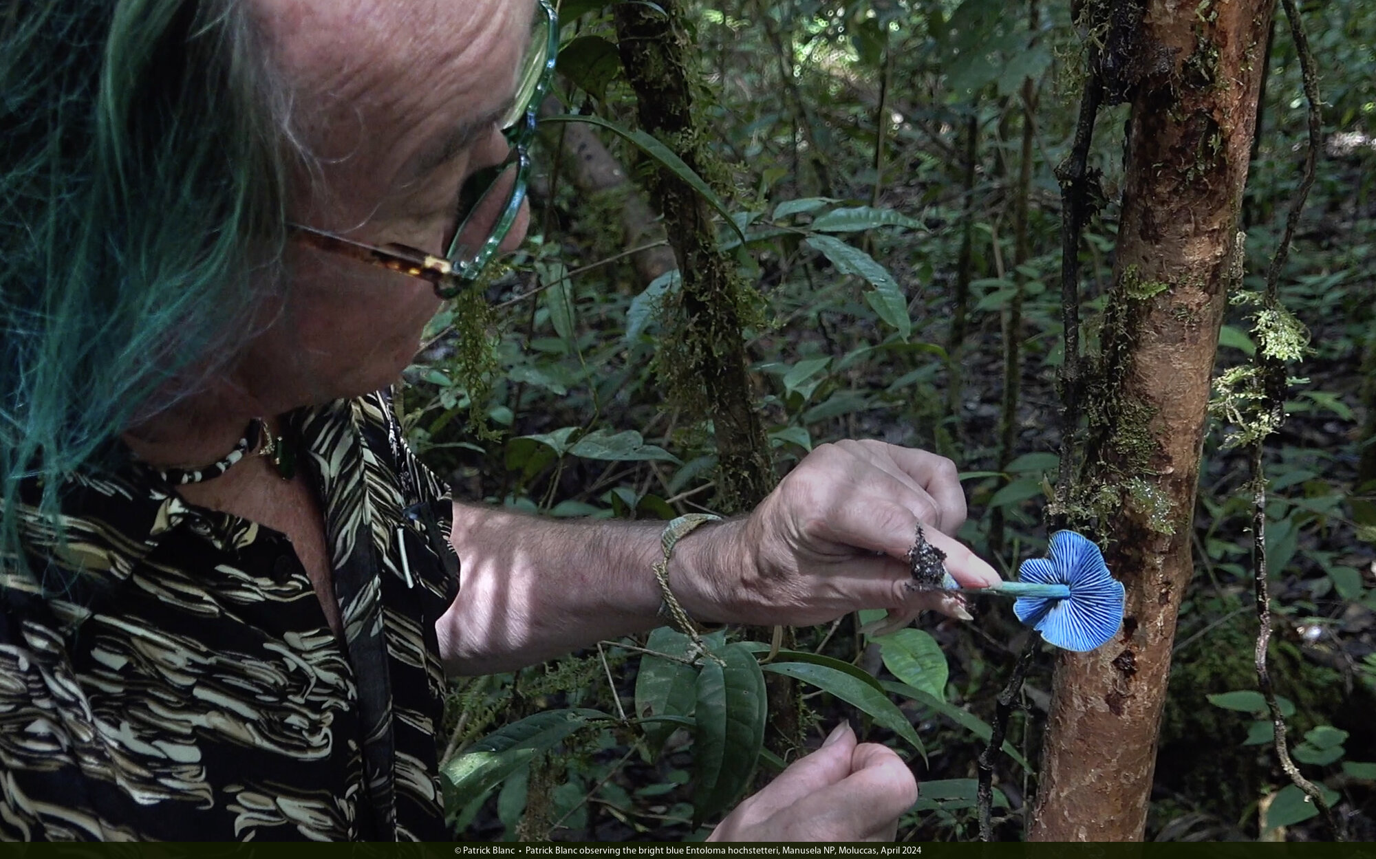 Patrick Blanc observing the bright blue Entoloma hochstetteri, Manusela NP, Moluccas, April 2024