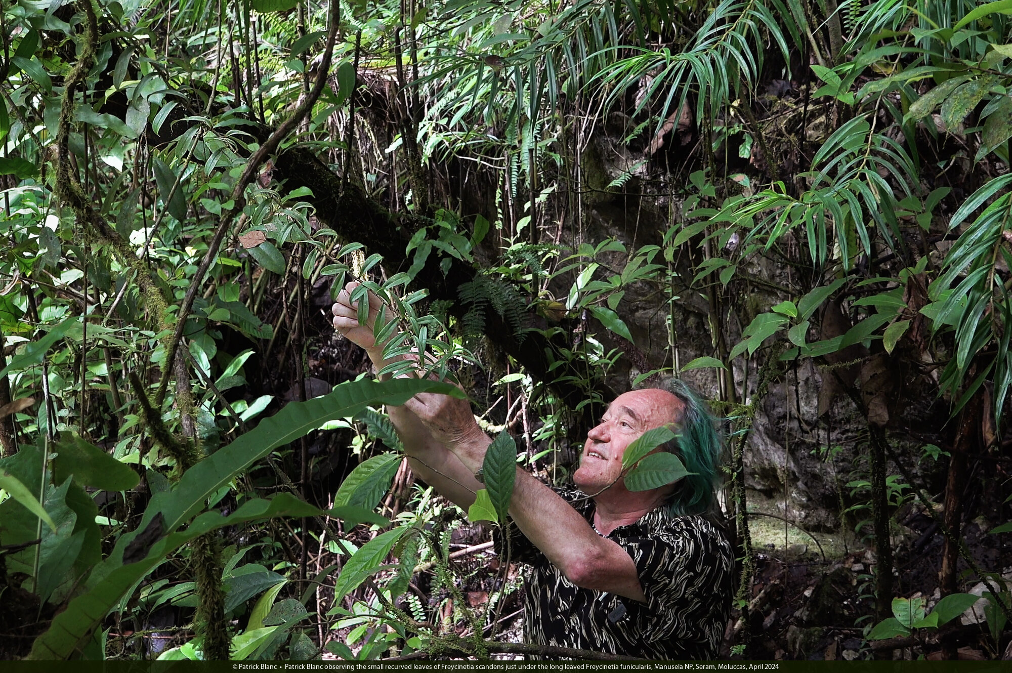 Patrick Blanc observing the small recurved leaves of Freycinetia scandens just under the long leaved Freycinetia funicularis, Manusela NP, Seram, Moluccas, April 2024