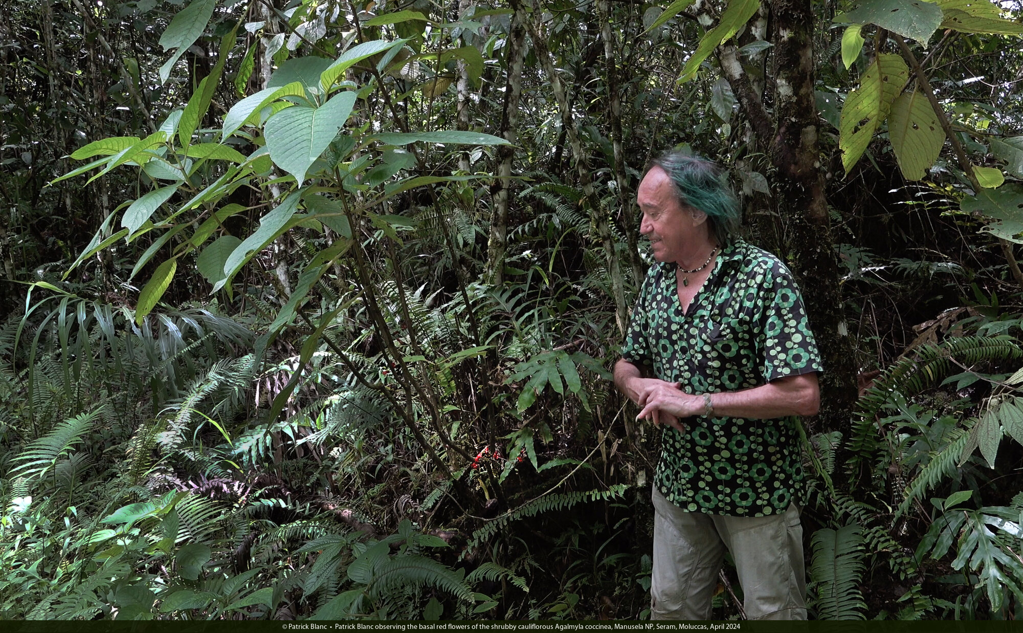 Patrick Blanc observing the basal red flowers of the shrubby cauliflorous Agalmyla coccinea, Manusela NP, Seram, Moluccas, April 2024