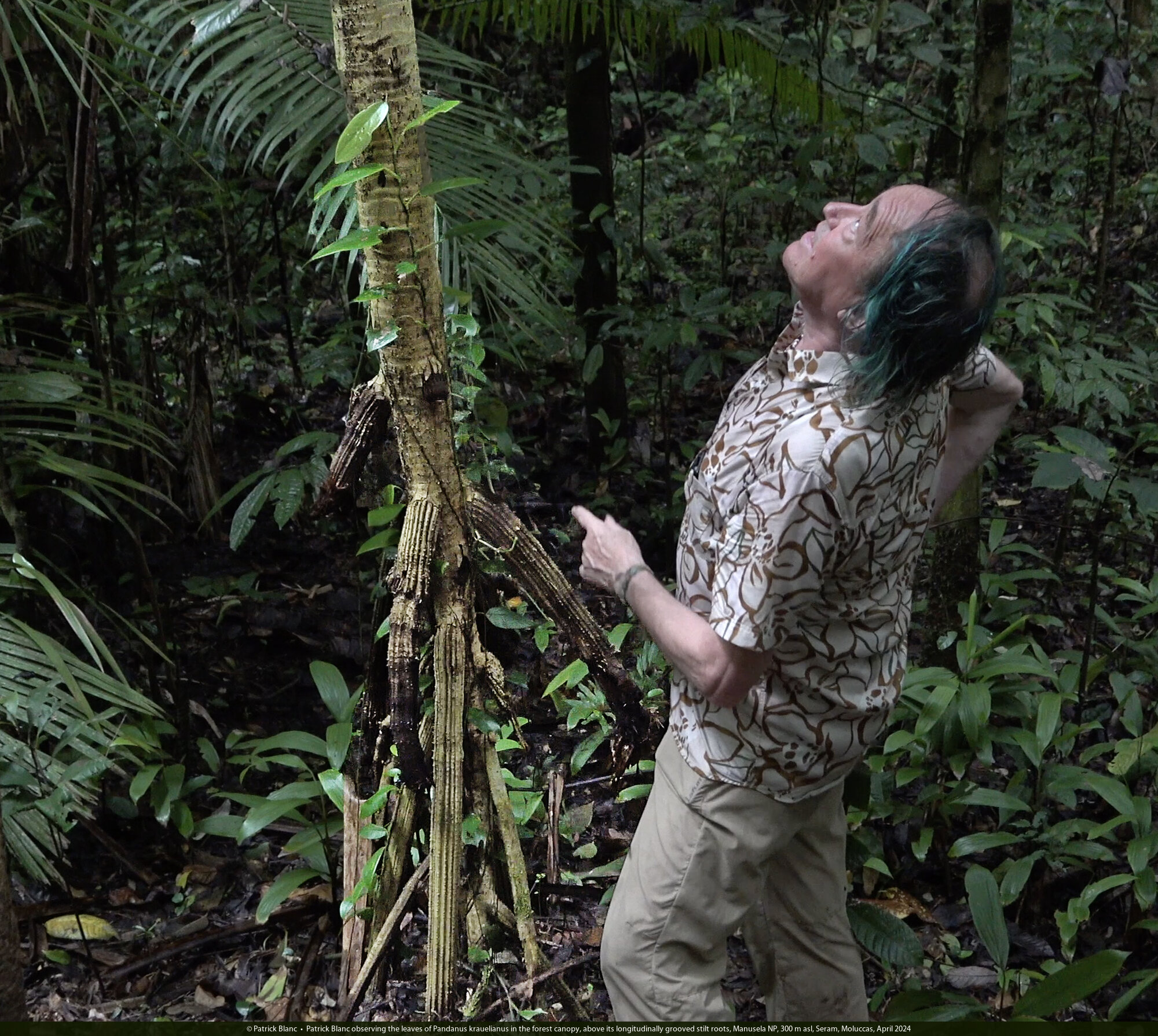 Patrick Blanc observing the leaves of Pandanus krauelianus in the forest canopy, above its longitudinally grooved stilt roots, Manusela NP, 300 m asl, Seram, Moluccas, April 2024